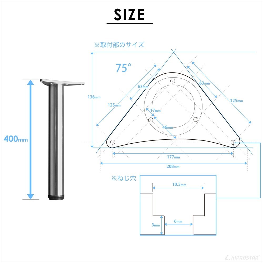 | 特徴 | ダイニングテーブルや店舗、カフェ、ショールーム、オフィスなどのテーブル脚に最適です。さまざまな天板サイズに取り付け可能で取付も簡単。 |