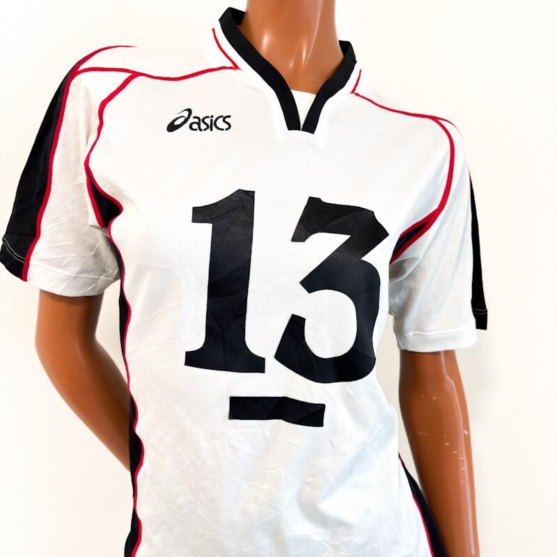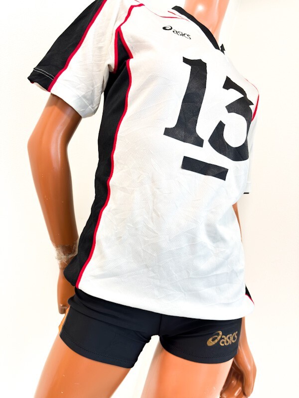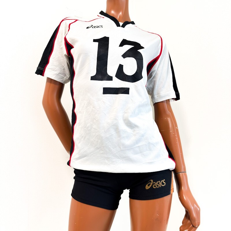 35アシックス女子バレーボールユニフォームトップスS+アシックスブルマM程度★KUNUGIマーキング★光沢白ホワイト赤+光沢黒オレンジ★半袖