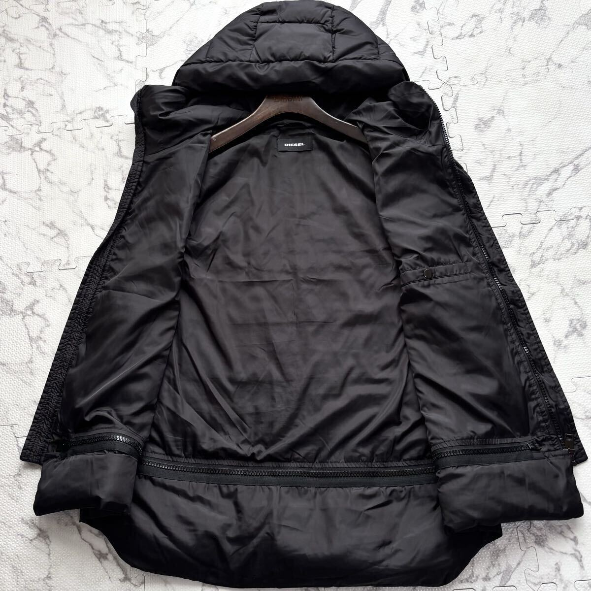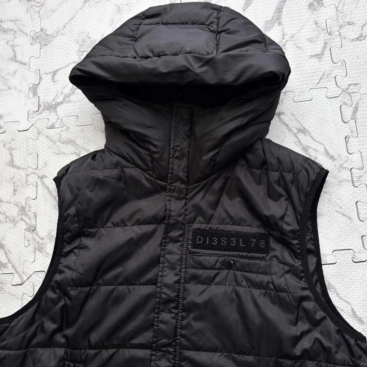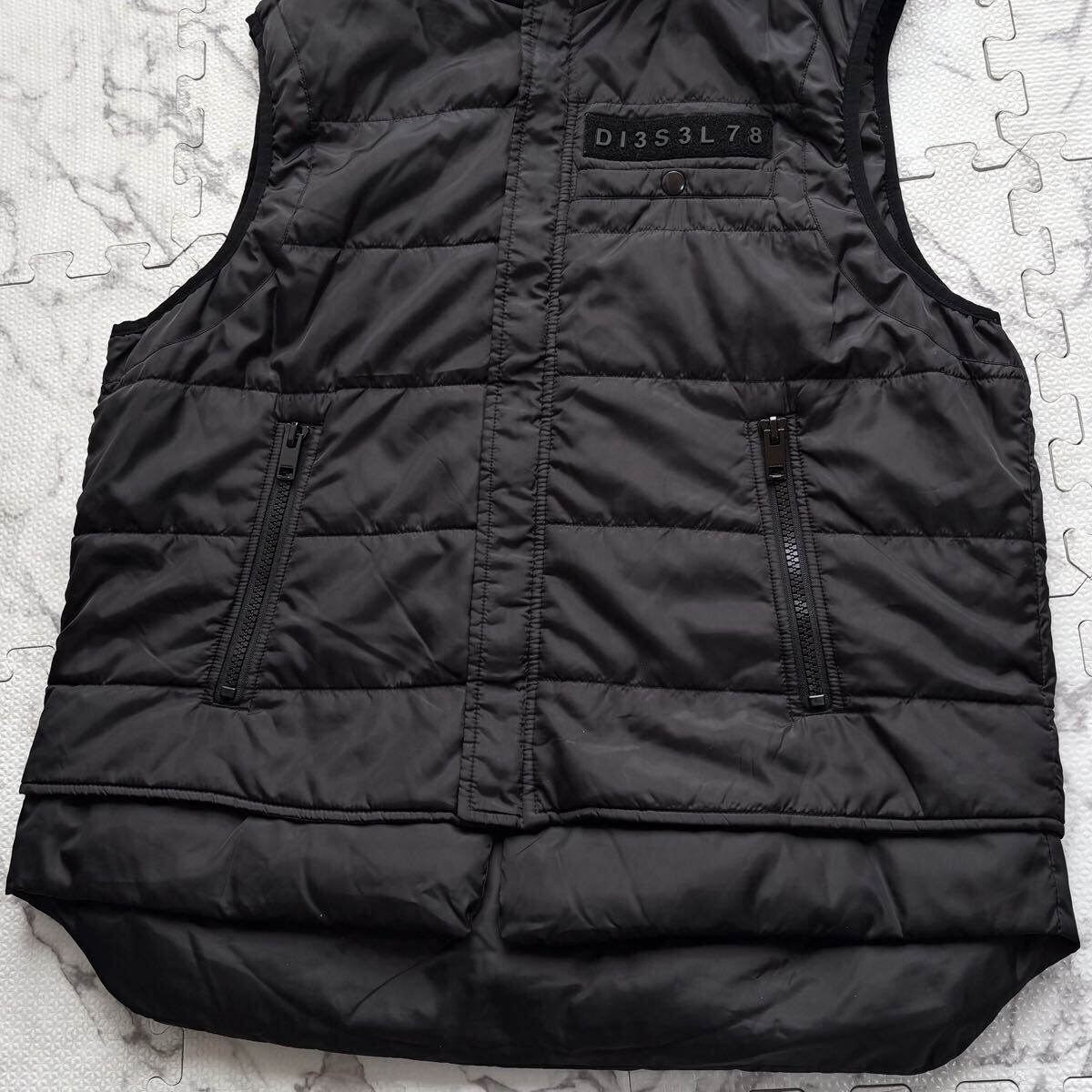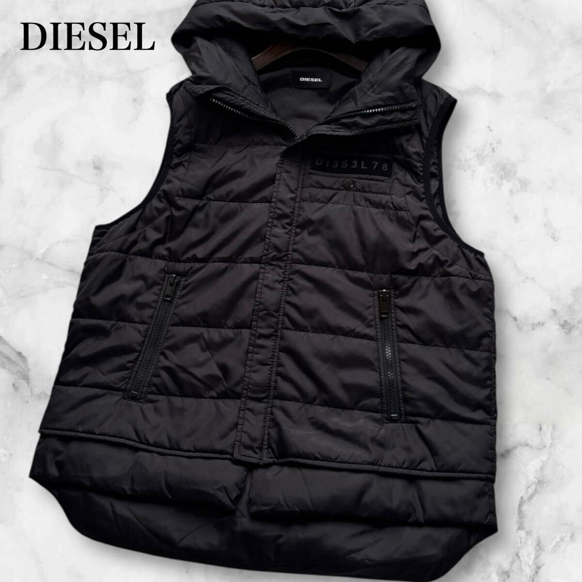 極美品/L相当●DIESEL ディーゼル 中綿 ダウンベスト ジップアップ パーカー フード ジャケット 胸元ワッペン ブラック 黒 メンズ 軽量◎