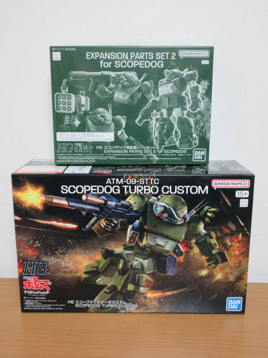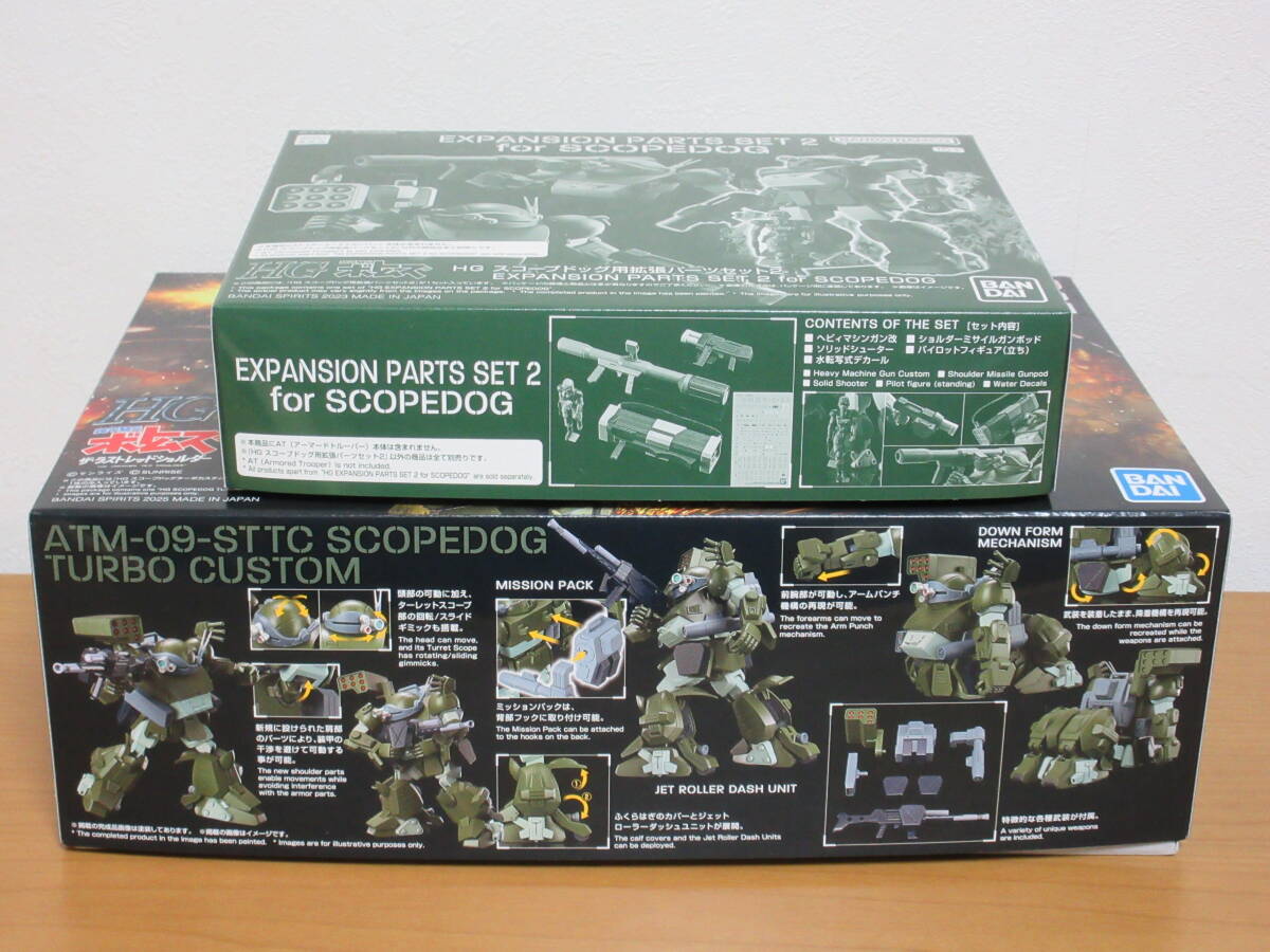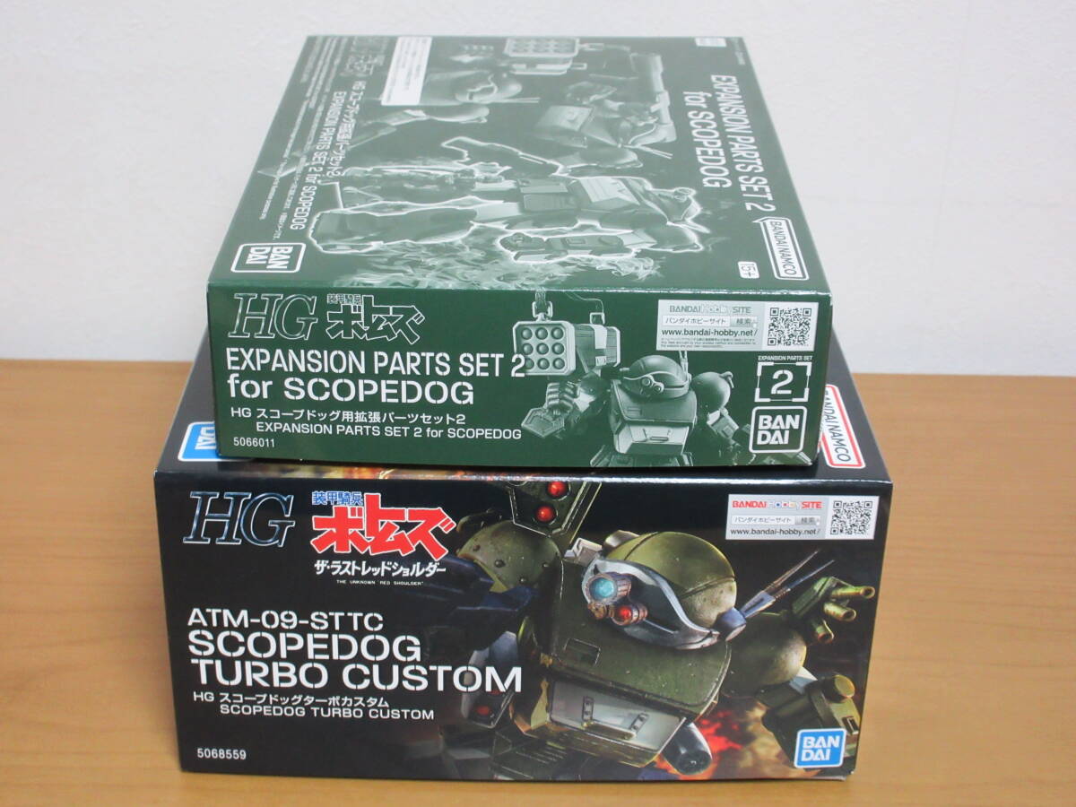 バンダイ 装甲騎兵ボトムズ HG スコープドッグターボカスタムと プレミアムバンダイ限定 HGスコープドッグ用拡張パーツセット2 の未組立品2点セットとなります。