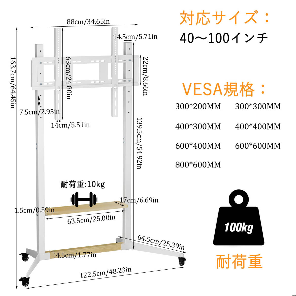 40~100インチまで対応可能な大型テレビ・モニター用の自立式テレビスタンドです。