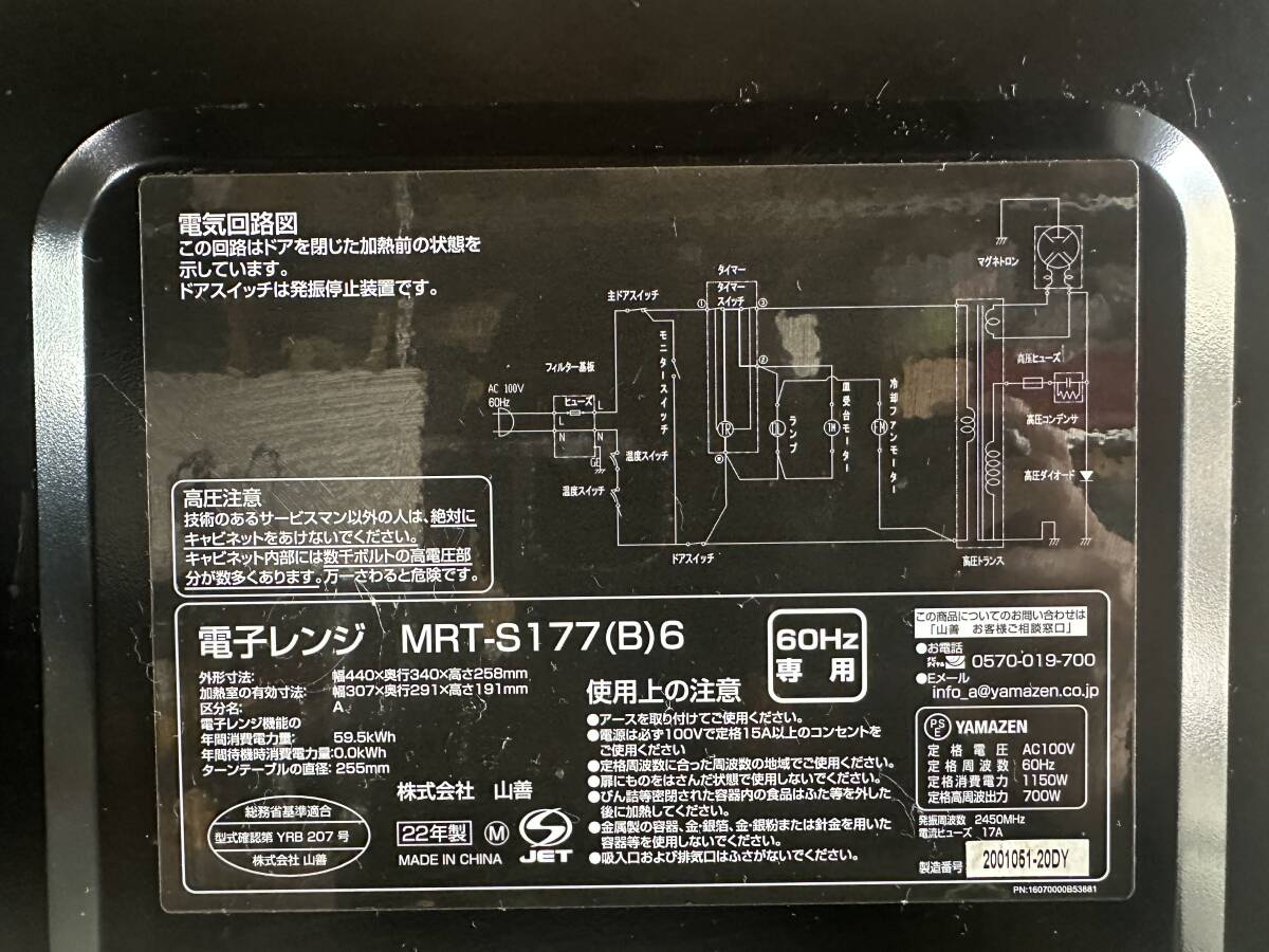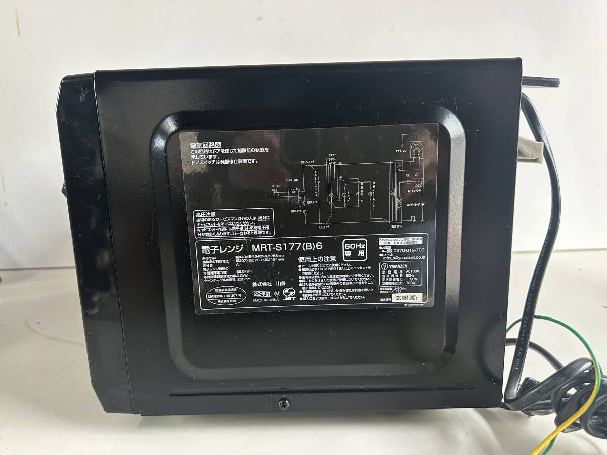 YAMAZEN 山善 電子レンジ MRT-S177(B)6 ブラック 60Hz専用 2022年製 家電製品 キッチン用品 動作品 写真にあるのが商品すべてとなります。 *その他の付属品はございません。 ◆商品状態◆ こちらの商品は代理出品となります。 中古品ですので傷や汚れがございます。 動作良好です。現状で使用いただけます。 初期不良があった場合は返金にて対応いたします。 商品の返送→確認→返金という流れになります。 現状使用できていても、保管中、輸送中に故障する可能性はございます。 上記内容でご了承の上入札ください。 商品は1点物につき返品、交換できませんので、ご理解の上入札ください。 以上ノークレームでお願いします。 *記載内容と異なる場合はご連絡ください。 | ||||