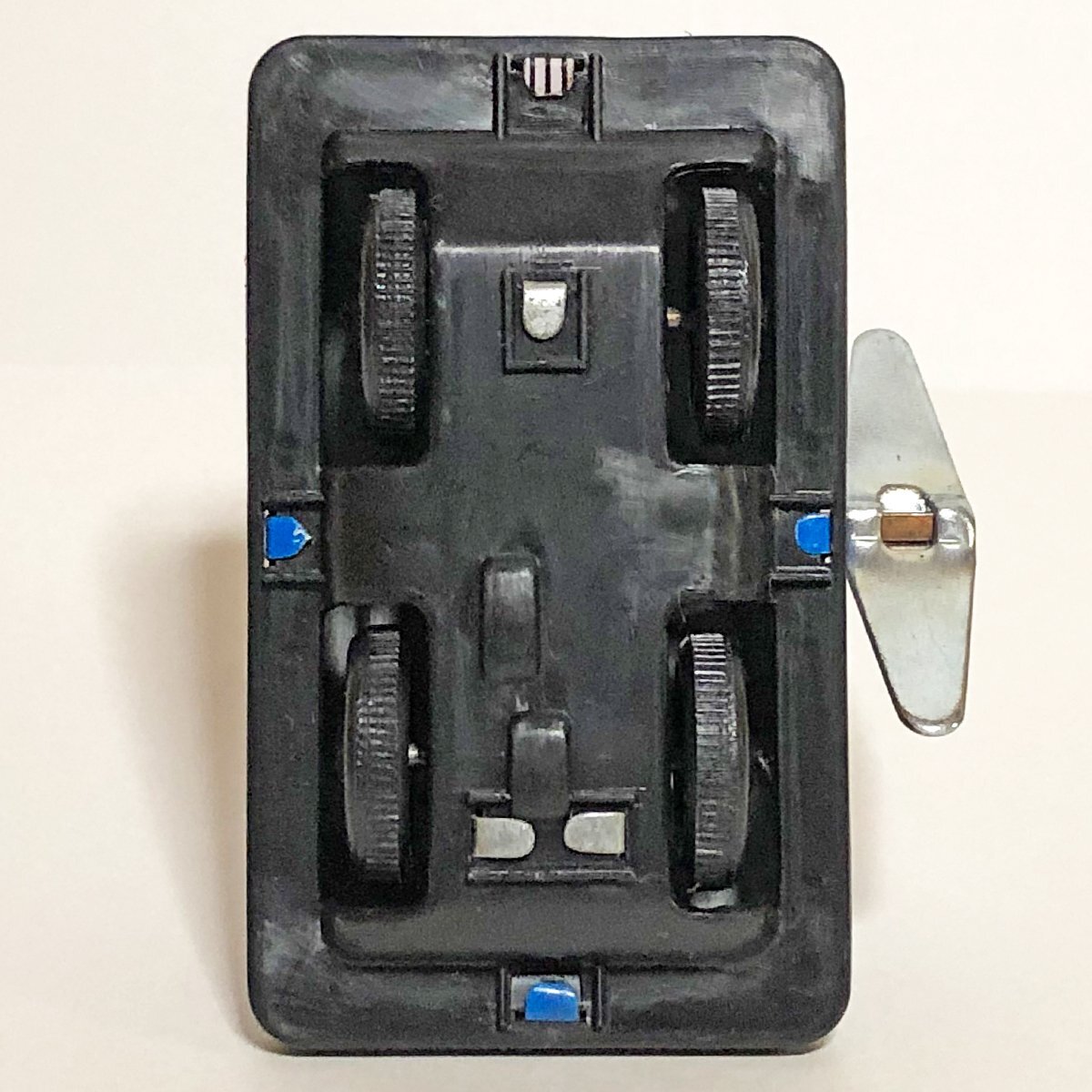 無駄に大きく作られたように見えるゼンマイノブ、実はよく計算されて作られており、まだ力が弱い小さなお子様でも巻きやすく、走らせるとゆっくり逆回転しながら微妙な間隔で地面に接地し、 車のの方向を変えながら走ります。