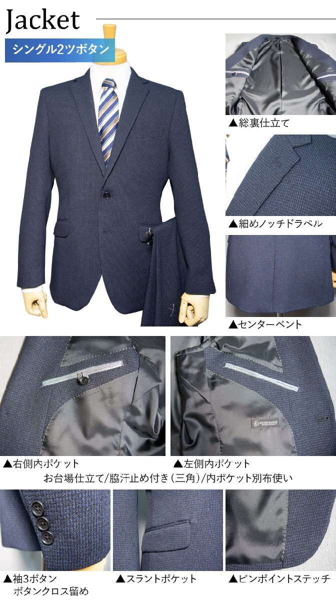 | ジャケット | シングル2ボタン 細めノッチドラペル 総裏 センターベント 袖3ボタン ボタンクロス留め ピンポイントステッチ 汗止め付き(三角) お台場仕立て 内ポケット別布使い スラントポケット |