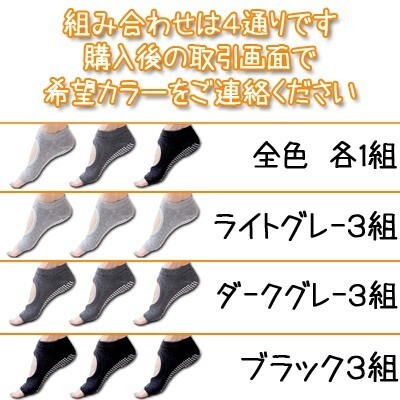 | 商品説明 | 購入後の取引画面で、希望カラーをご連絡下さい ライトグレー3組 ダークグレー3組 ブラック3組 全色 各1組 滑り止め機能付きのレディース ヨガソックスです