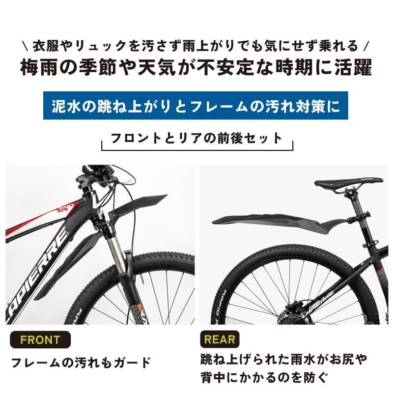 雨などの悪天候や路面がウェットの時に前輪や後輪から跳ね上げられる泥、雨水をお尻や背中にかかるのを防ぐアイテムです。 | |