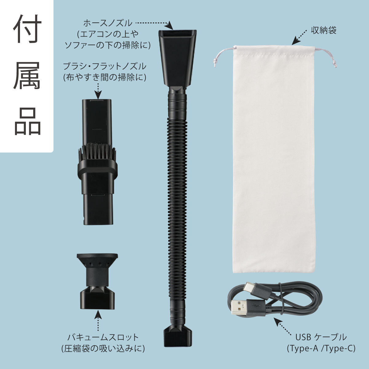 ■ 付属品:USBケーブル(USB Type-A入力端子/USB Type-C出力端子、約0.8m)、ブラシ・フラットノズル、ホースノズル、バキュームスロット、収納袋、保証書付取扱説明書