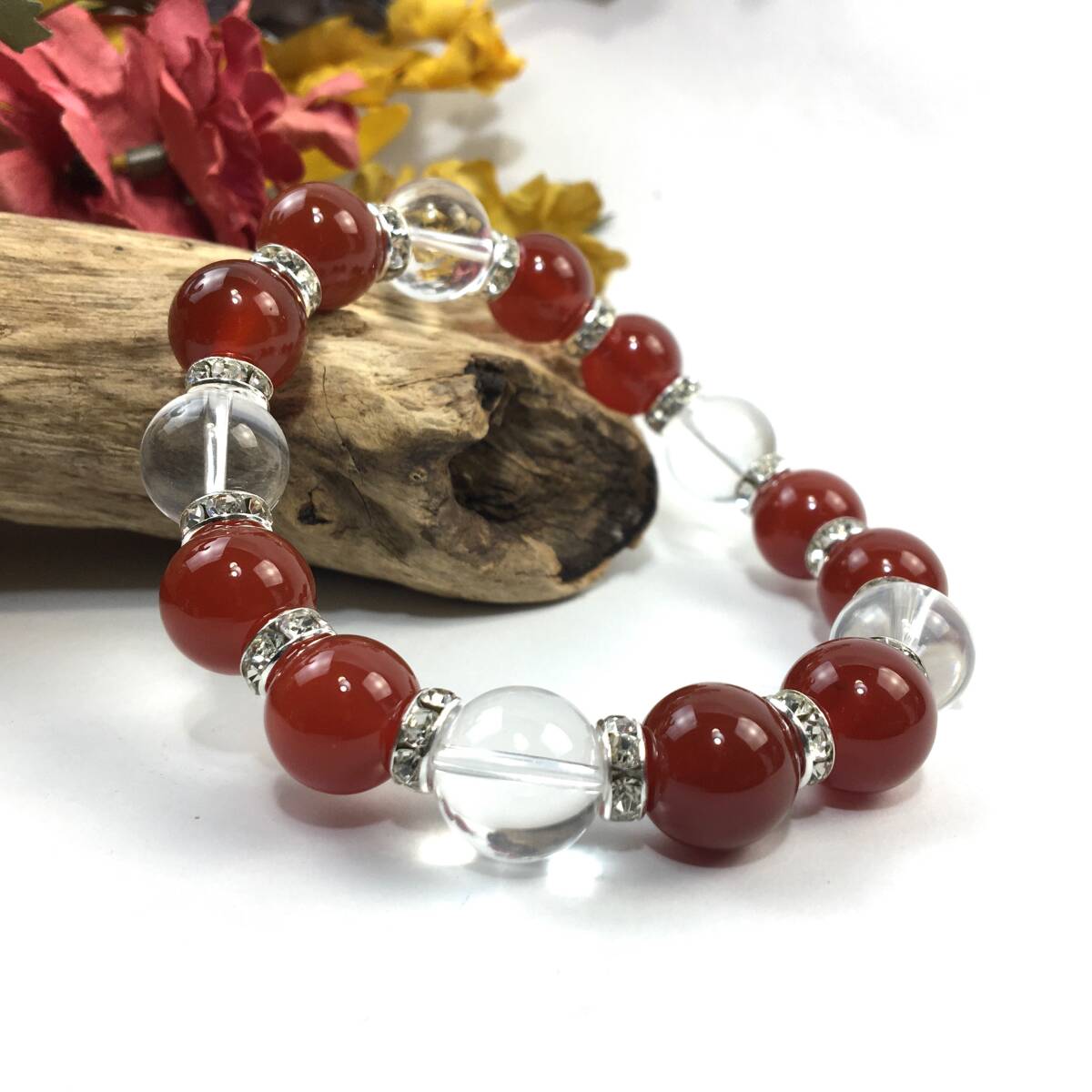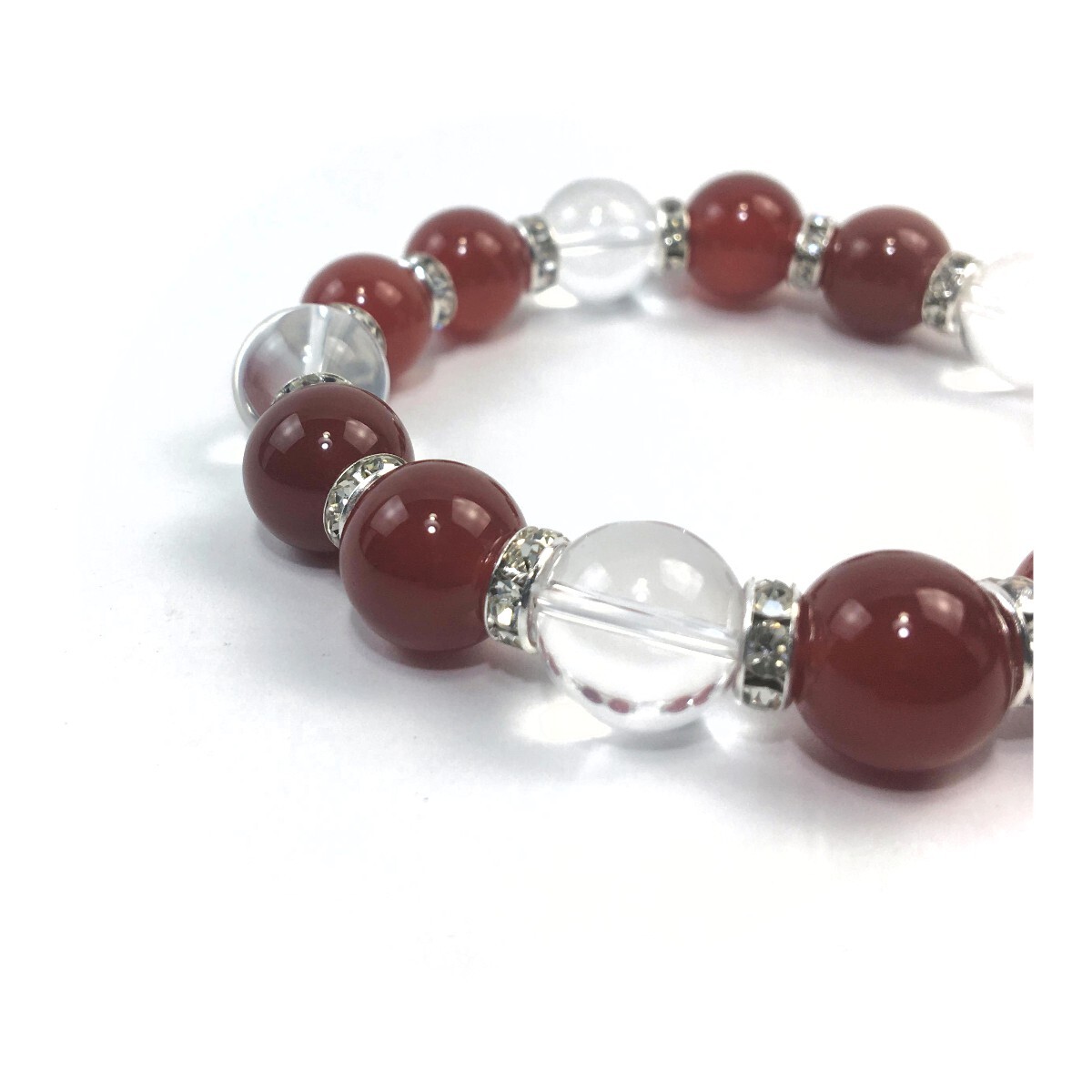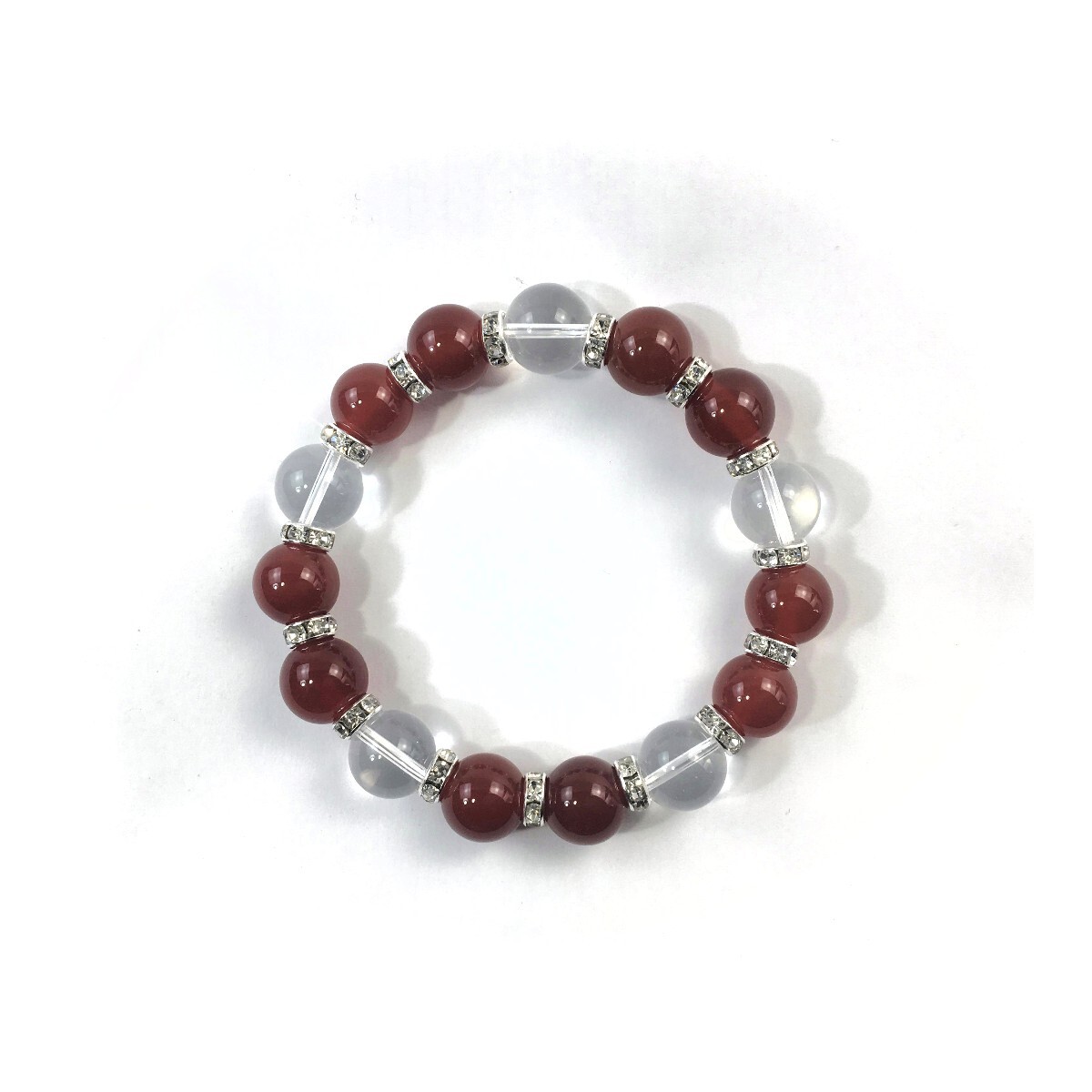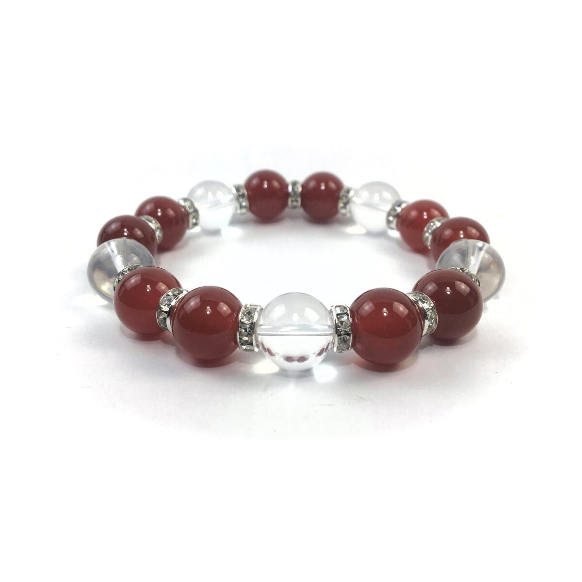 こちらは、赤瑪瑙と水晶を組み合わせたパワーストーンブレスレットです。間にはロンデルを挟み高級感あるデザインに仕上げております。石大きさは12mm玉を使用して内径約18cmです。気になる方は是非この機会にどうぞ。