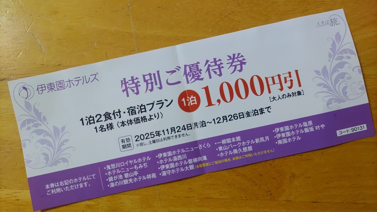 券面に記載のホテルの1泊2食付き・宿泊プランが、1名様1000円引きになります。