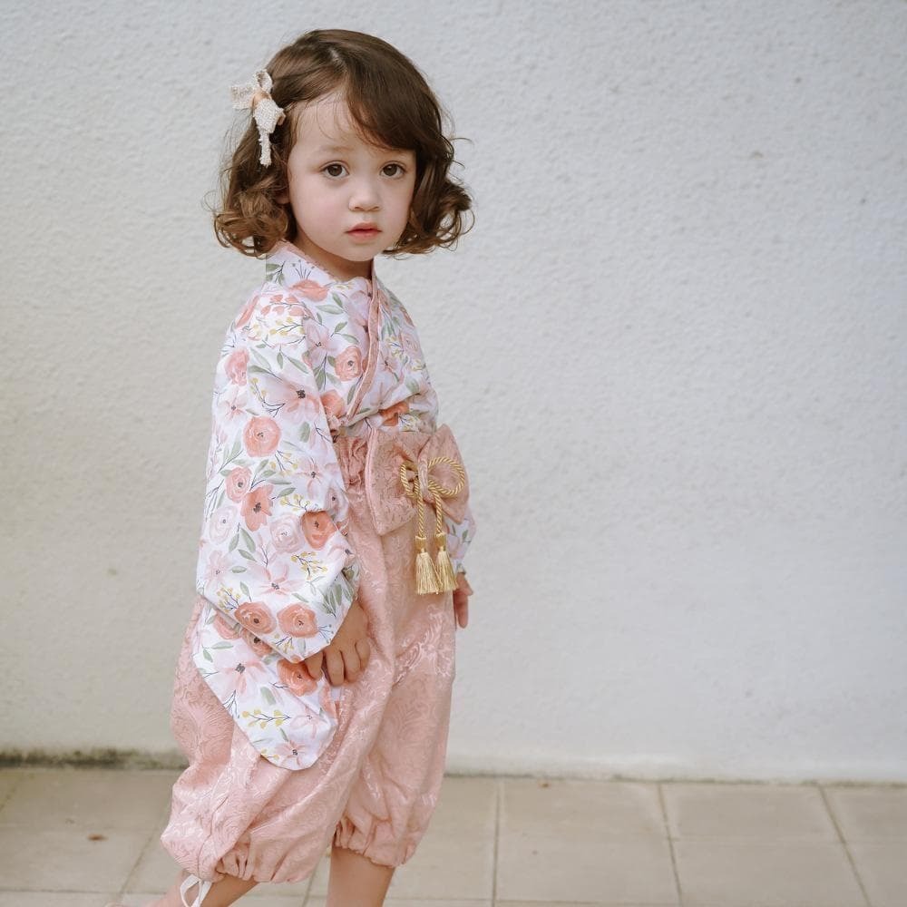 セパレートタイプのベビーキッズ袴、上下2点セット♪こちらは光沢があり高級感溢れるジャガード織りの生地を採用し、特別な日にピッタリです。上は短肌着や甚平のように紐とスナップボタンで脱ぎ着ができ、かぼちゃパンツは股スナップボタンで全開にできるのでおむつ替えも楽ちん♪お宮参りやお食い初め、初節句のお祝い、お正月、七夕、お祭りなど幅広いシーンで活躍します!