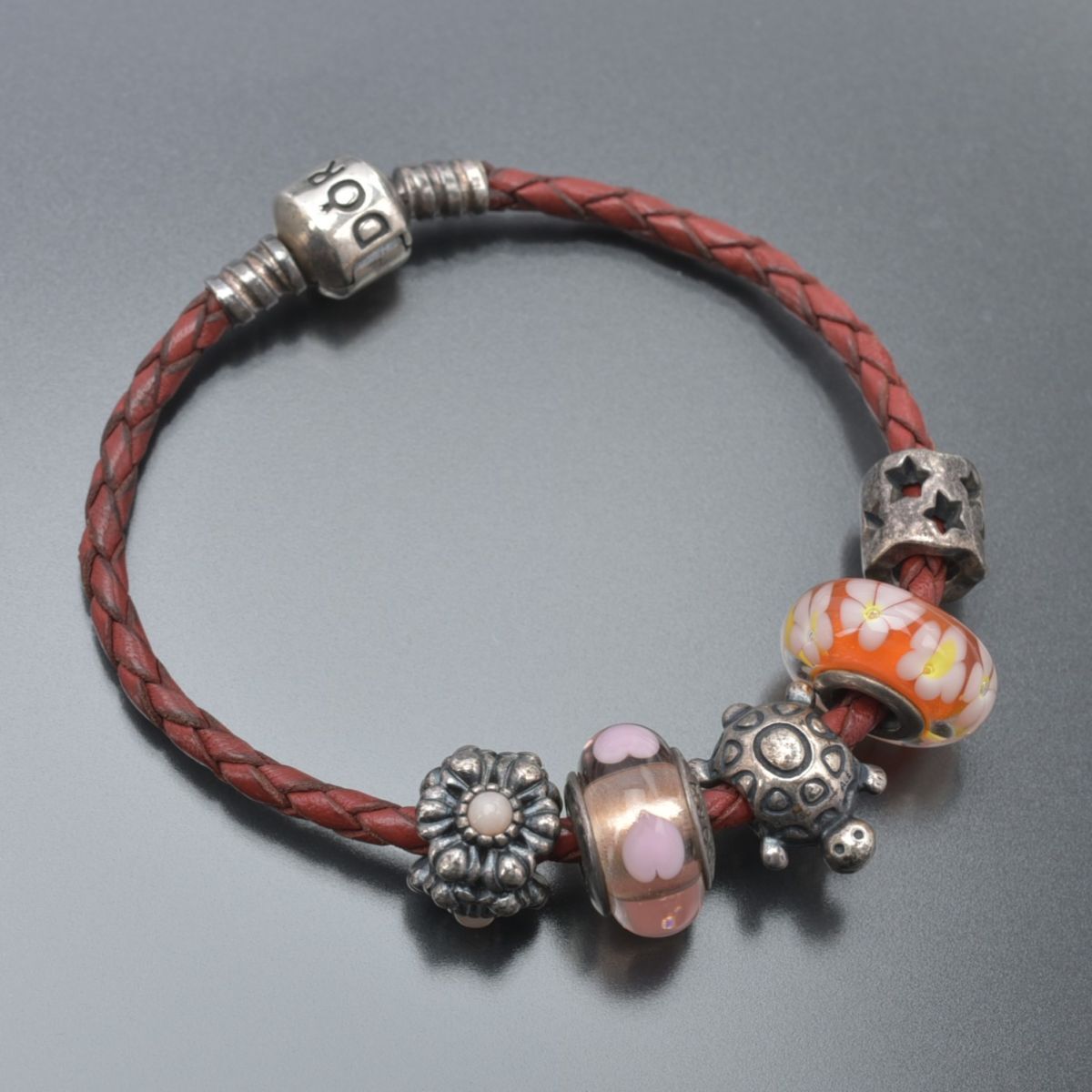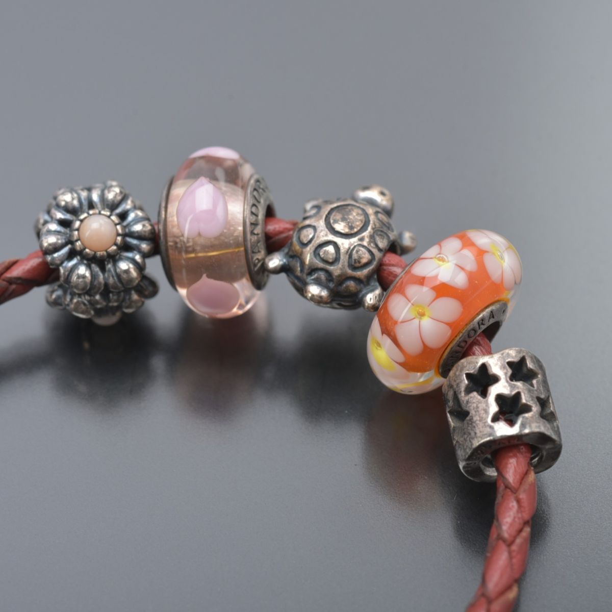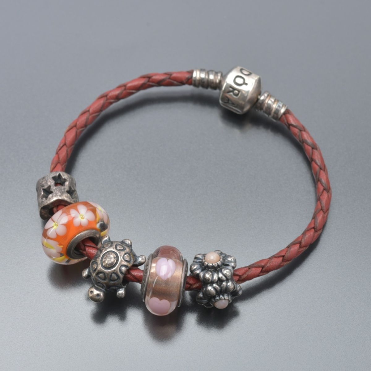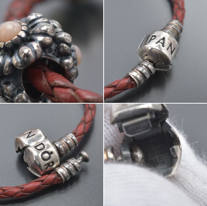 良品 PANDORA パンドラ SV ブレスレット S925刻印 袋付き タートル チャーム レザー 編み込み レッド シルバー アクセサリー #N※1113-61/0