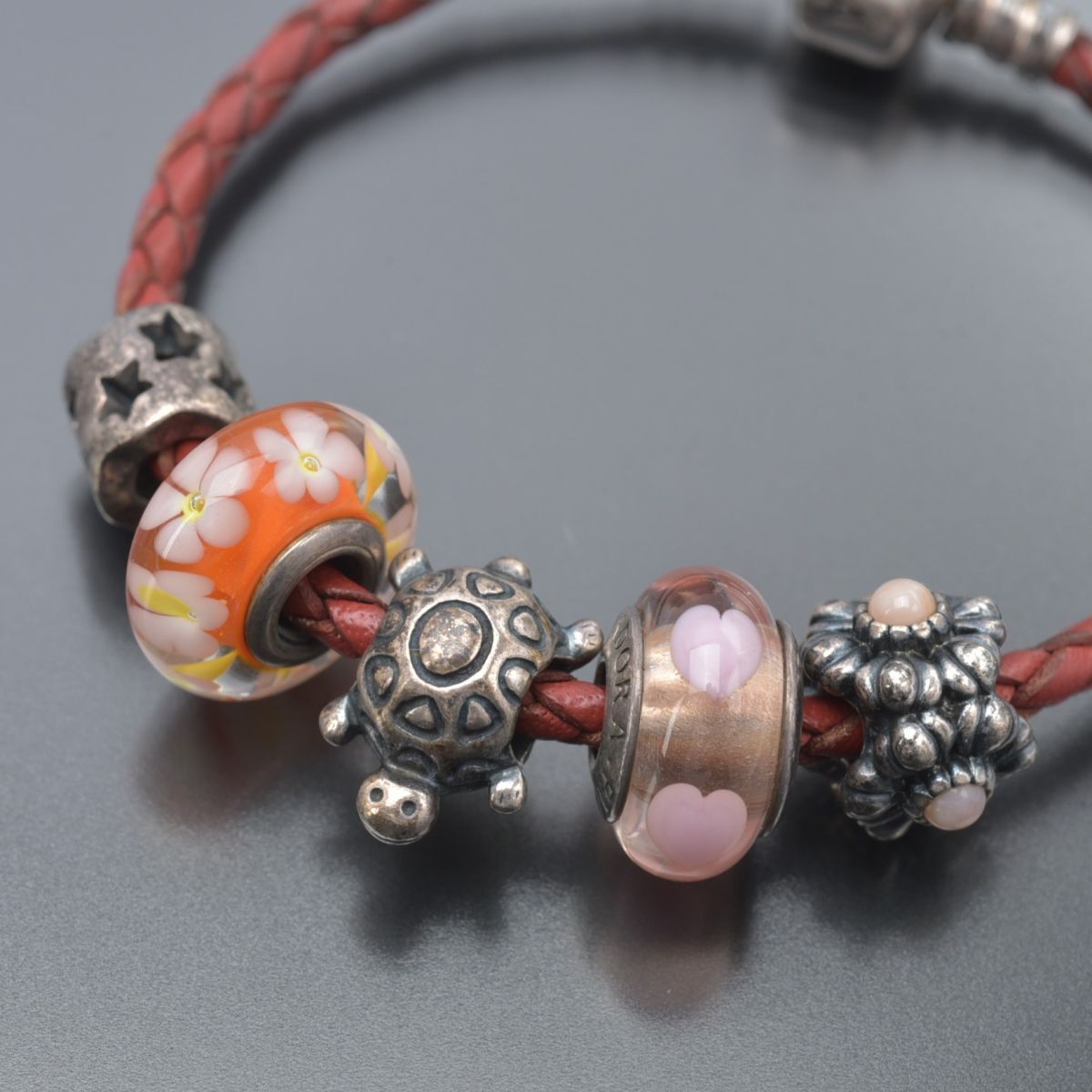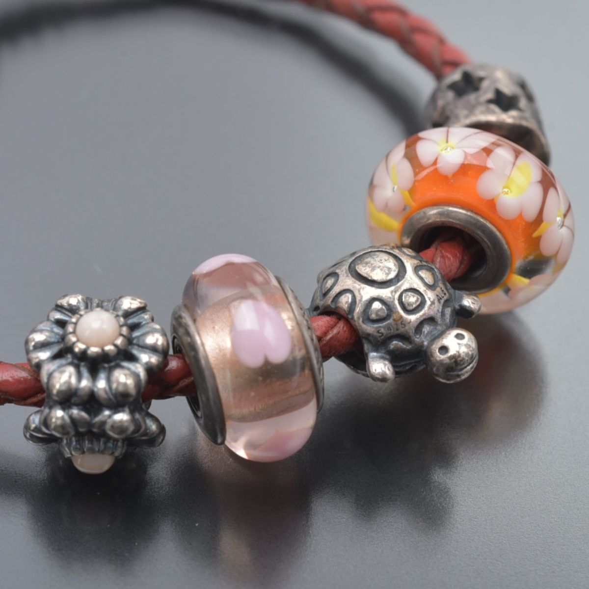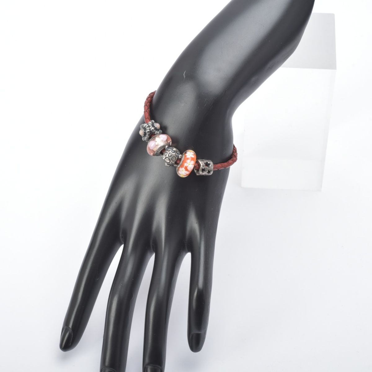 良品 PANDORA パンドラ SV ブレスレット S925刻印 袋付き タートル チャーム レザー 編み込み レッド シルバー アクセサリー #N※1113-61/0