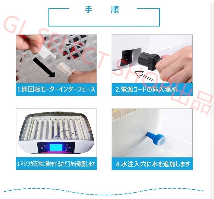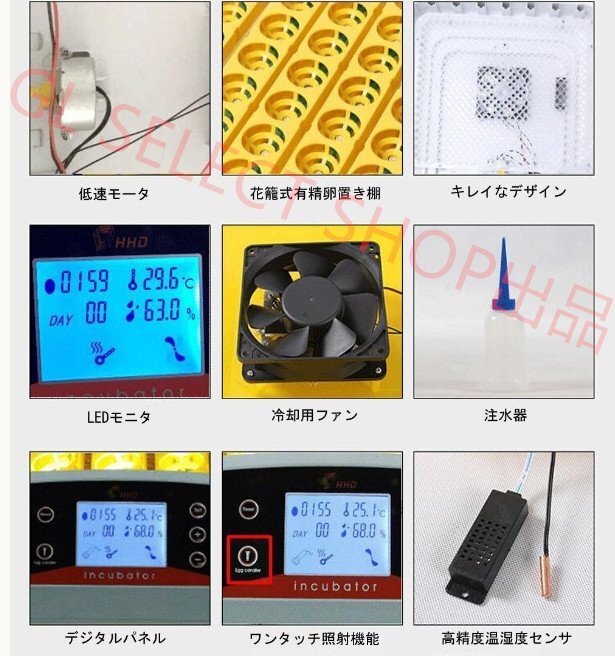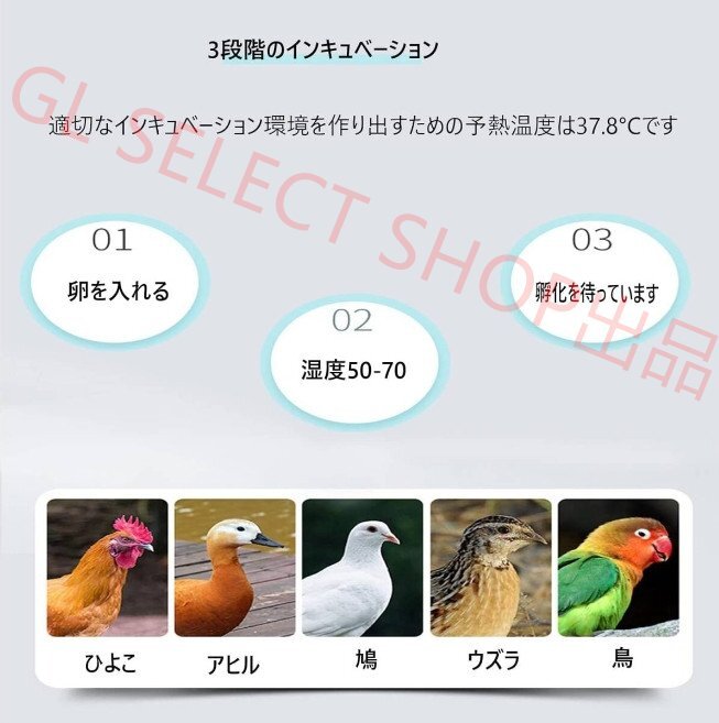• 2時間一回全自動転卵、出殻できず雛数を減って、孵化成功率を増えます。