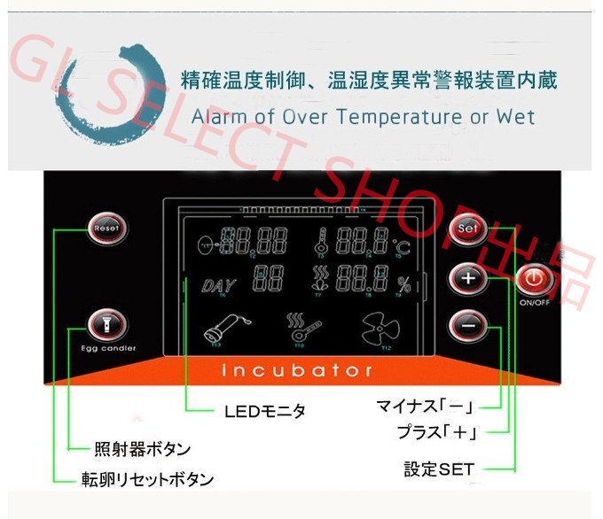 • 温度設定範囲:30度-39度(孵卵器内の温度は周囲の温度により変わる場合がありますので、夏場と冬場はご注意ください。)