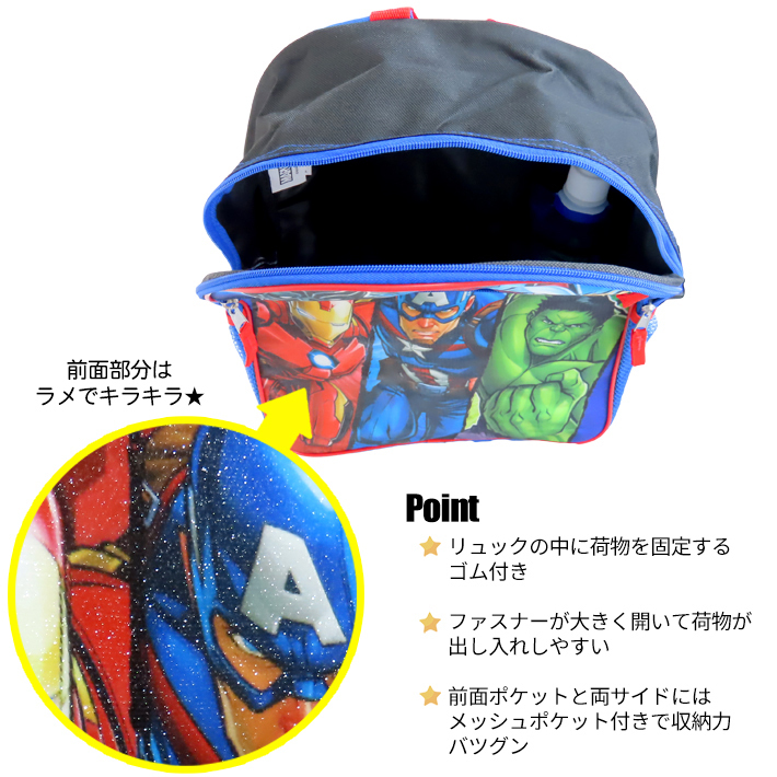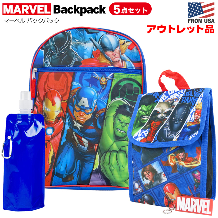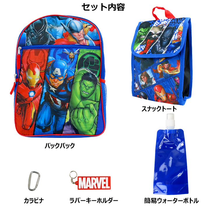 MARVELの人気のスーパーヒーローが大集合。たくさんのキャラクターが描かれたバックパックです。