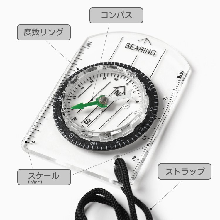 ◆スケールコンパス 登山コンパス クリアデザイン マップ用コンパス 方位磁石 度数リング 首掛けストラップ付き 軽量 小型 ハイキング トレッキング 防災用品 MMCP7044