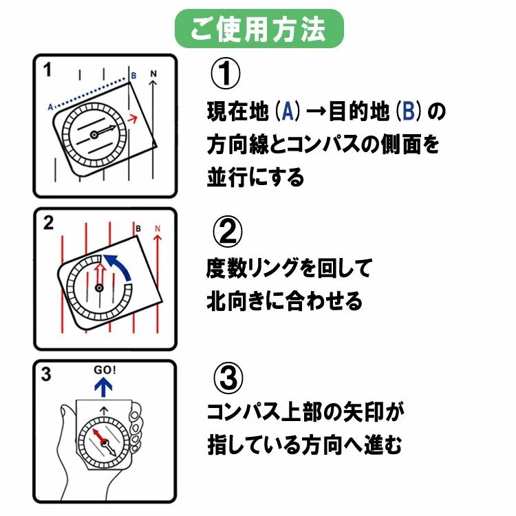 ※使用方法の詳細を確認する場合は、インターネット等で登山コンパスの一般的な使用方法をご確認ください。