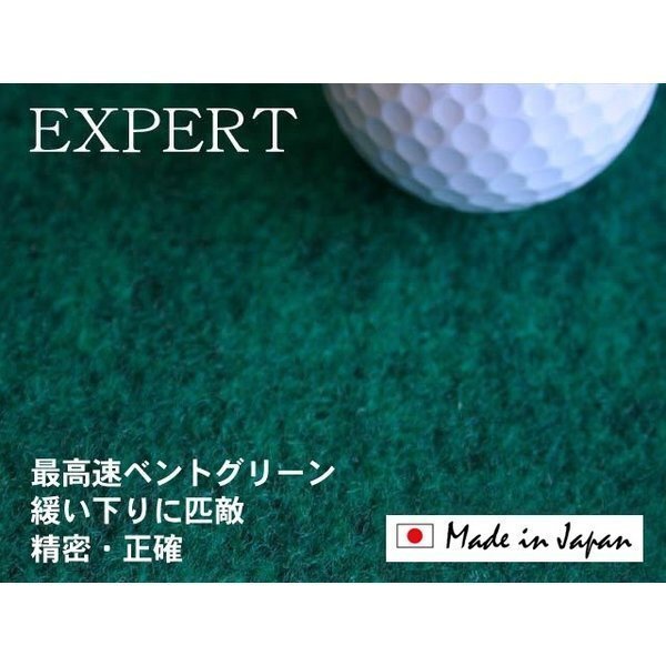 EXPERTパターマット。日本製のどこまでも精密で繊細な上質パターマットです。ほんの少しのタッチの違いも感じ取れる高速パターマットとして、競技志向の上級者からも高い評価をいただいております。パット数に差がつく高速グリーンや緩い下りラインの攻略に最適です。非常に均質なマット生地です。しっかりしたフェルト状の不織繊維がなめらかな表面を形成しています。色も落ち着いたグリーンでたいへん良い質感です。パターマットにありがちな巻きぐせやシワが発生しにくく、収納も簡単です。付属の「距離感マスターカップ」(特許庁意匠登録認定)を使って、高速パッティングを攻略してください。