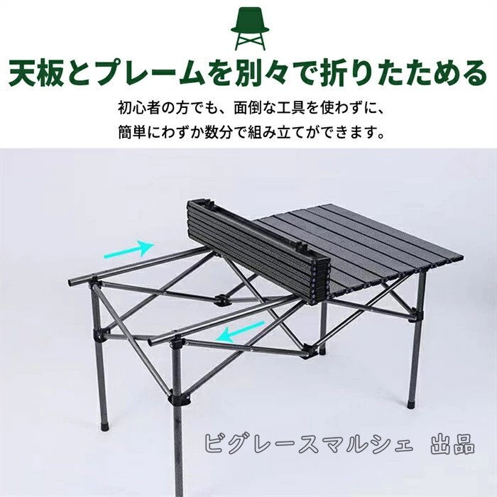 天板とフレームはそれぞれ折りたたみ式で、初心者でも数分で簡単に組み立て可能。使わない時は付属の収納バッグにコンパクトに収納でき、持ち運びやすさも抜群。