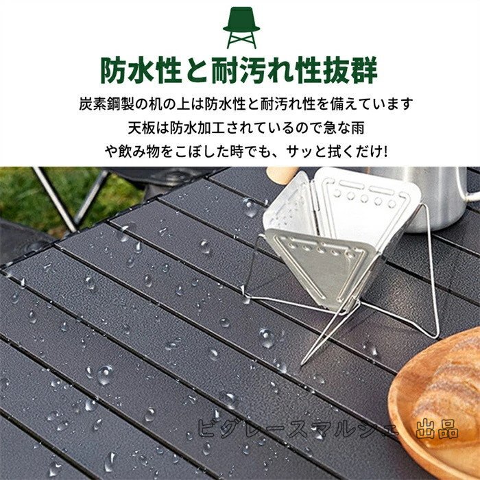 炭素鋼の天板には防水加工が施されており、飲み物をこぼしてもサッと拭くだけ。雨や汚れに強く、お手入れ簡単でアウトドアに最適です。