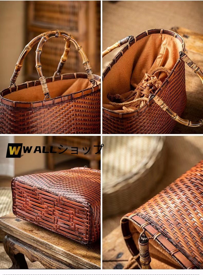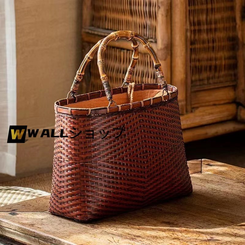 自然竹編み上げカゴバック  手作り藤バックバスケット ナチュラル買い物カゴ 収納バッグ