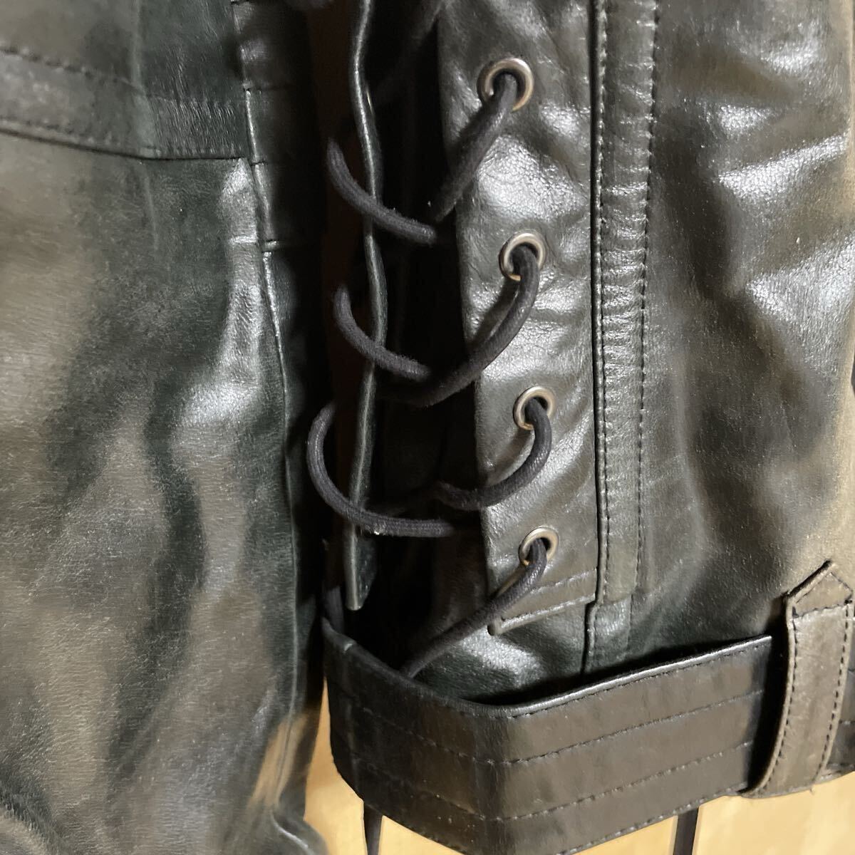 襟と袖口のスタッズがちょっとワイルドさを醸し出しています。また両側脇はレースアップで腹囲の調整ができます。