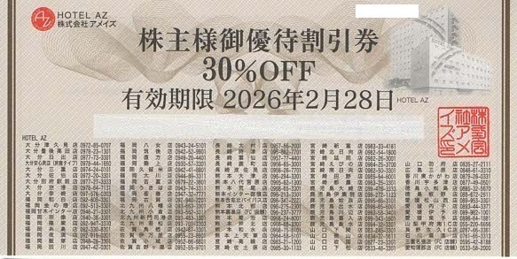 即決!アメイズ 30%割引 株主優待券 HOTEL AZ 複数あり