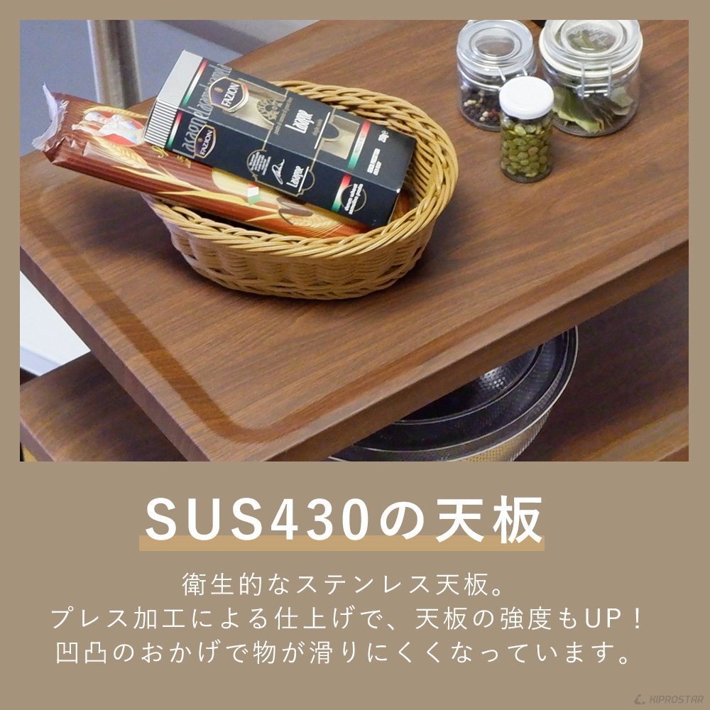 | 材質 | 天板:ステンレスSUS430(木目柄プリント) パイプ:ステンレスSUS201(黒色粉体塗装) キャスター:ポリカーボネート芯+ポリウレタンコーティング |