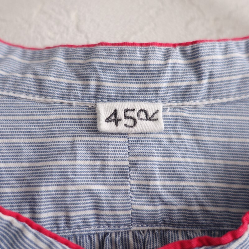 | 45Rの葉山ものがたりパジャマドレスです。カラーはライトブルー×ホワイトのピンストライプ&レッドです。程よいハリと厚みのコットン生地を使用。うっすら透け感がございます。赤いパイピングがポイントの、バンドカラーを配したプルオーバーワンピースです。バックはハンガーループ付き、背ヨークの下にギャザーが寄せられています。脇下袖にガゼットを配し、袖ぐりが広い仕立てで、袖口は剣ボロ・カフスの2ボタン留めです。裾はパイピングを配し、サイドはスリット入りです。前両腰にポケットがございます。オリジナルのタツノオトシゴと「R」のワンポイント刺しゅうがあしらわれております。定価(メーカー希望小売価格)33,000円の商品です。 |