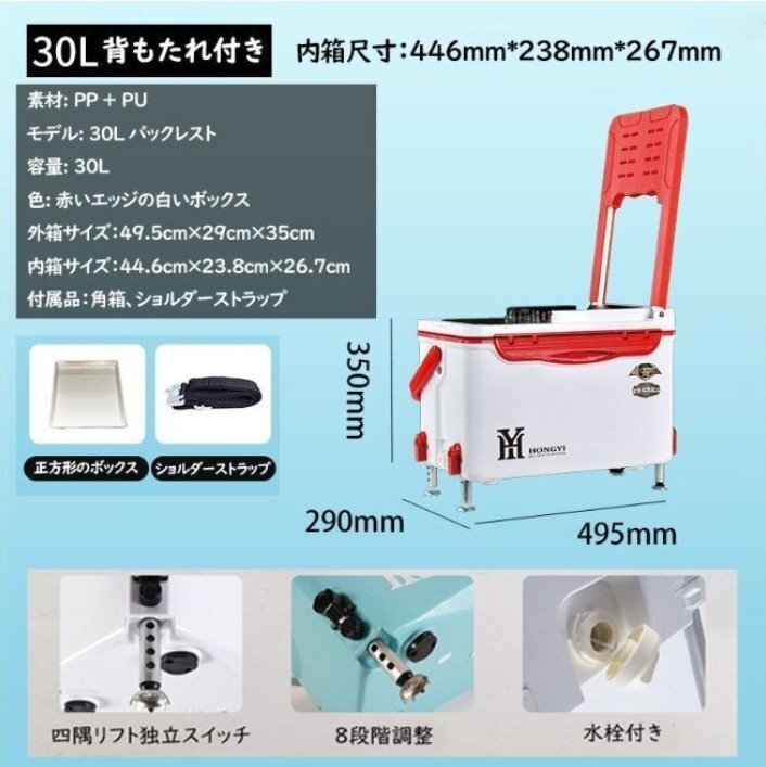 新品です 多機能クーラーボックス 釣り用 30L 保温保冷 釣り 防水 高さ8段調整可 ハンドル/釣りエサ箱/背もたれ/水栓付き(レッド)