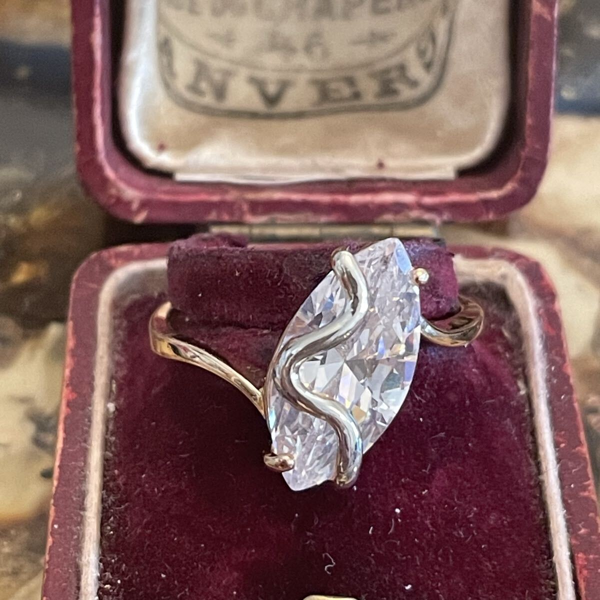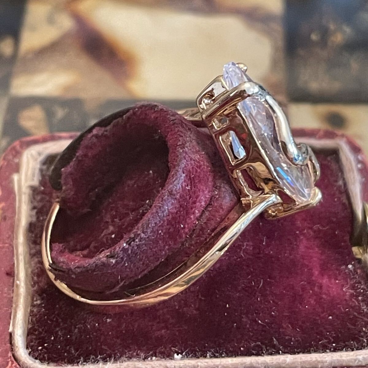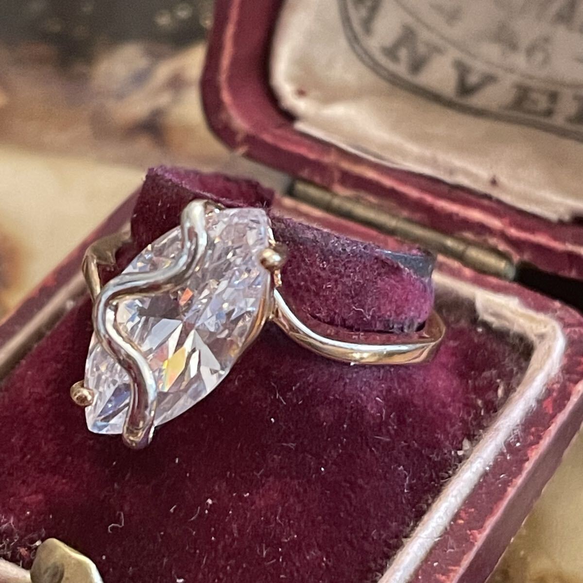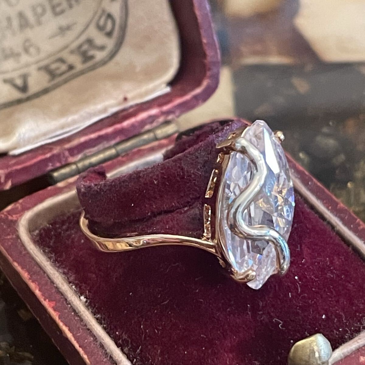 英国 イギリス ヴィンテージ アーモンド 金色 ゴールド クリア リング 19号 指輪 アール・ヌーヴォー 蚤の市 ブロカント ビンテージ アンティーク