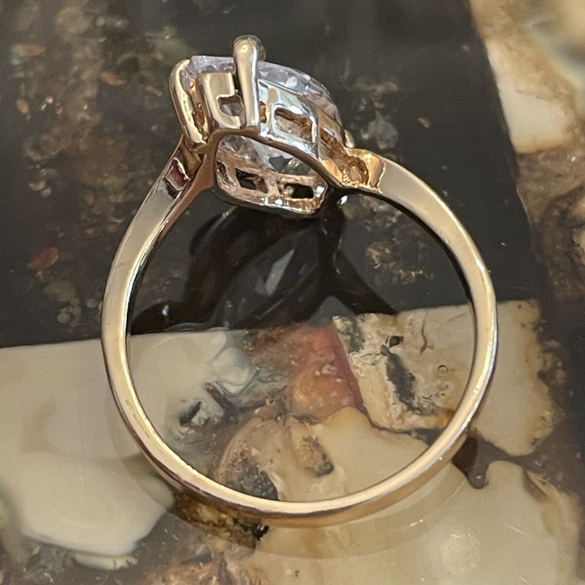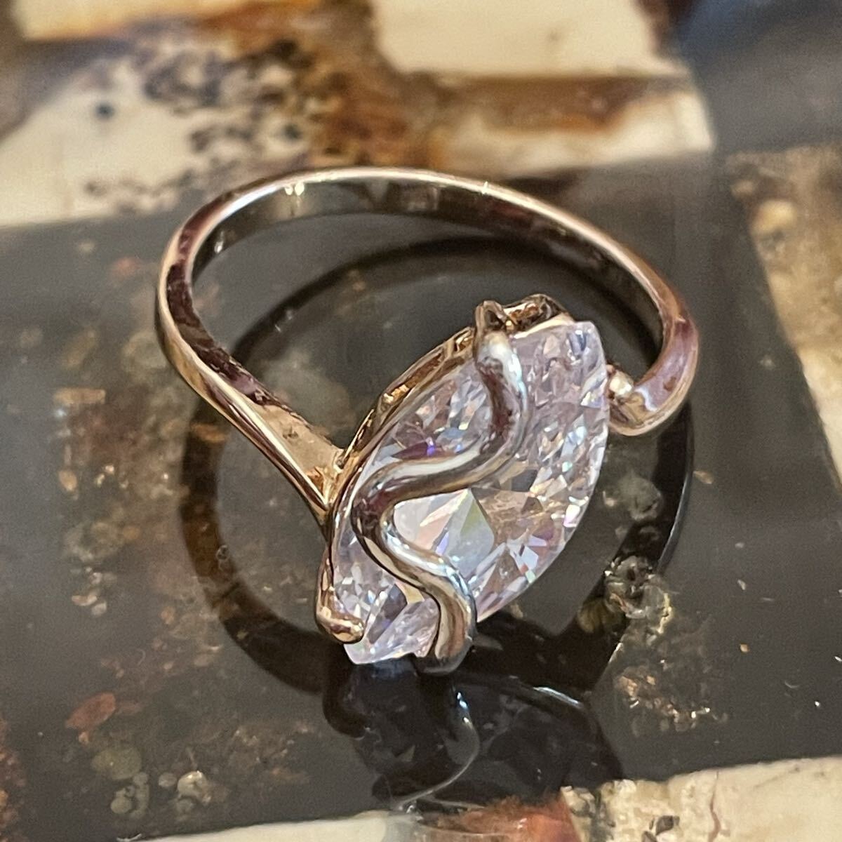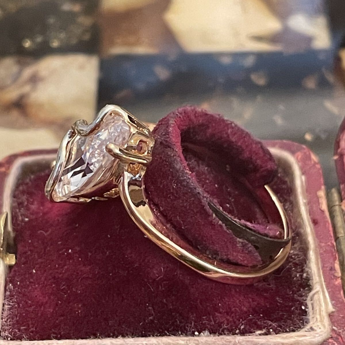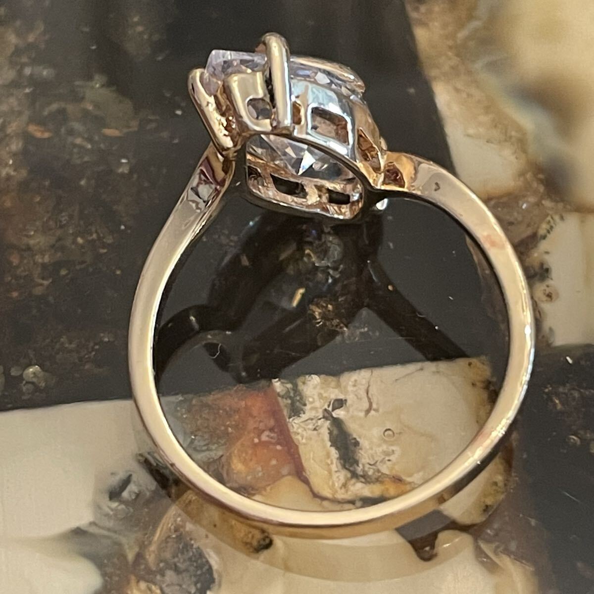 金属部分は素材不明。刻印無し。石はラインストーン。日本サイズで19号です。