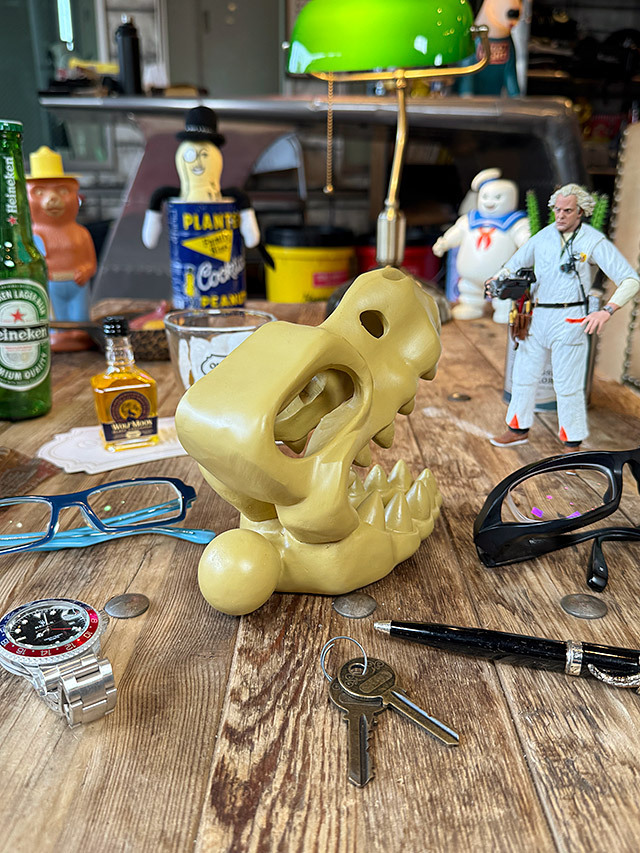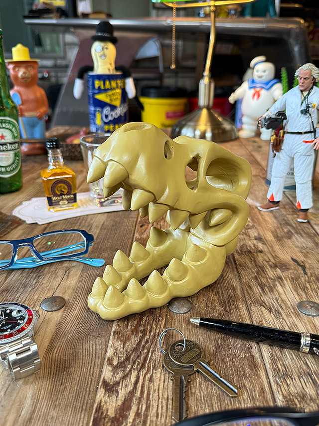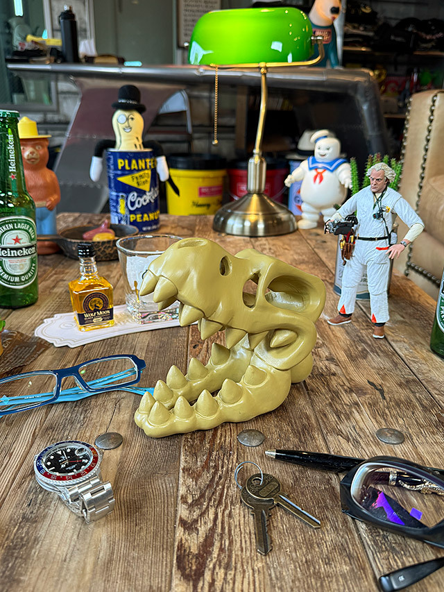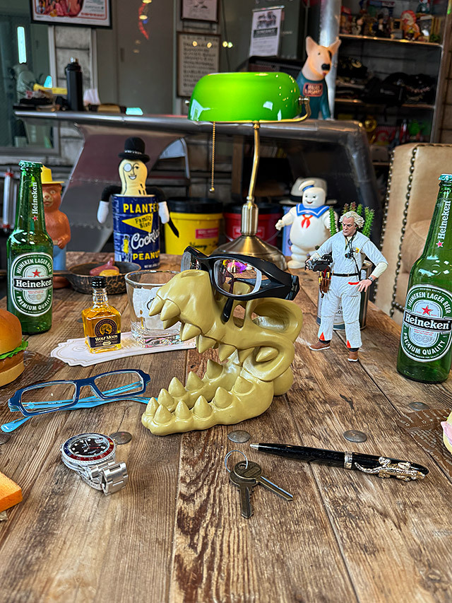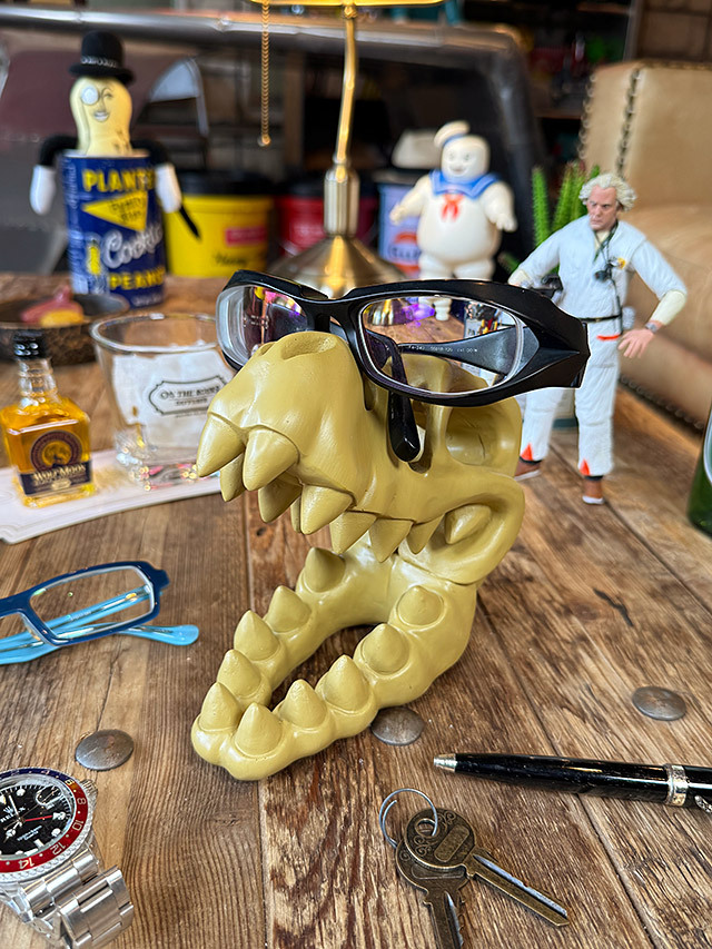 メガネホルダーをはじめ、目玉のところにペンホルダーにしたり、歯やツノをリングホルダーにしたりと、スケルトンの形状を活かして、枠にとらわれない使い方で楽しむのが、インテリアとしても面白そう!