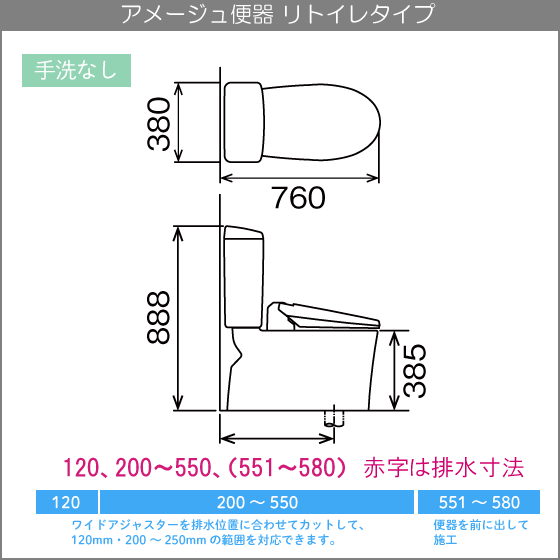 ・ 排水可変範囲(便器後方の壁から排水芯120mm、200mm~580mm)