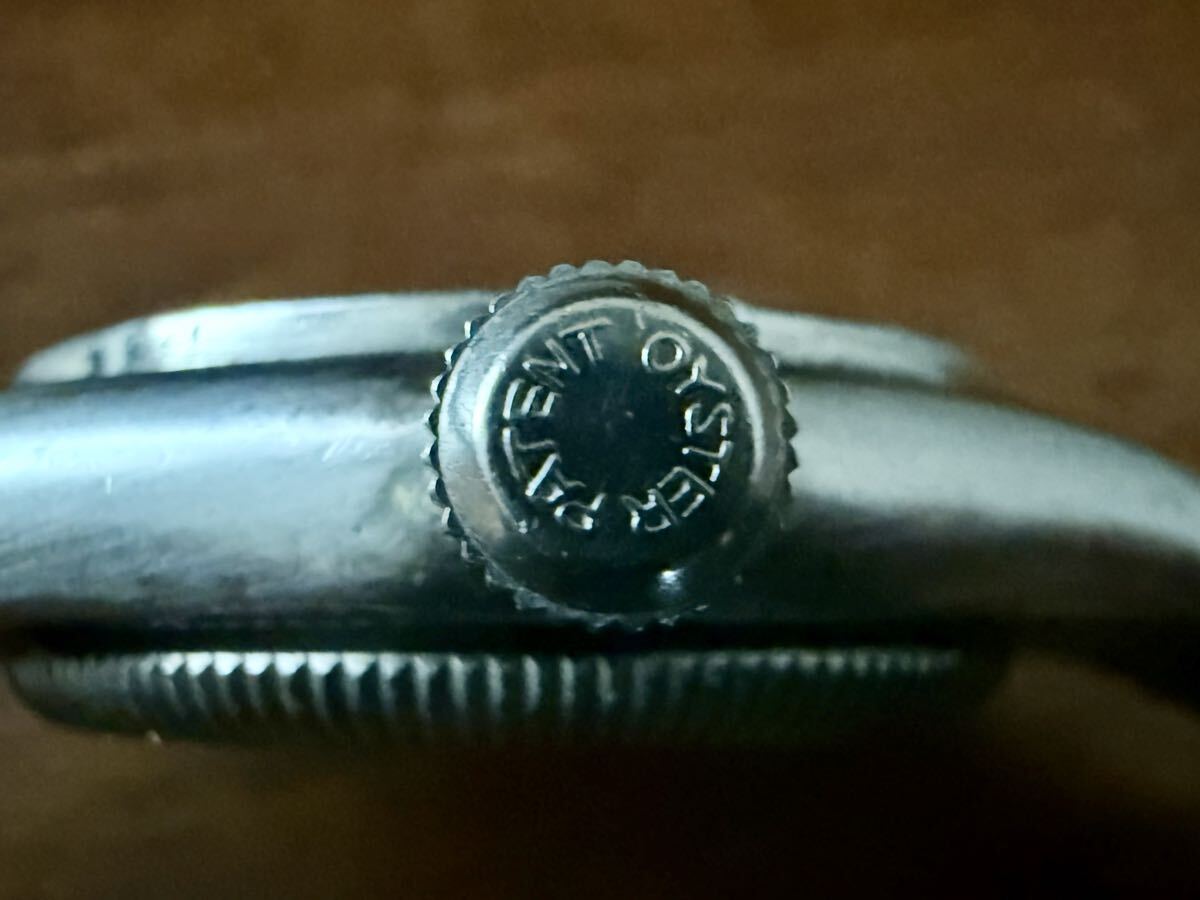 ケースは小ぶりなフラットベゼルで、"OYSTER PATENT"リューズのねじ込みも良好です。