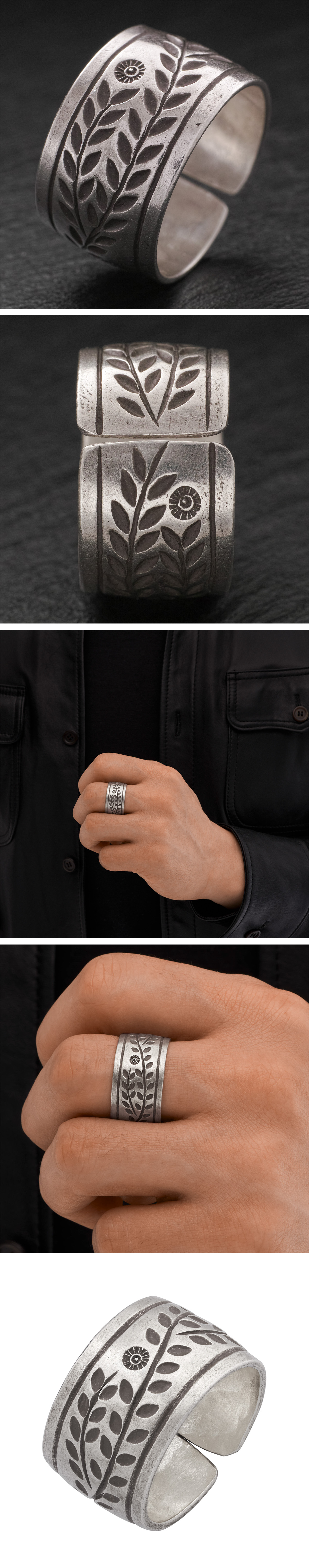 ぐるりと一面にあしらった植物文様 植物文様をぐるりと一面にあしらい、まるで月桂樹の冠のような極太で平打ちのカレンシルバーリングです。 中ほどにゆるやかなふくらみを持たせたフォルムは見た目よりも軽やかさを感じさせます。 生命力の象徴でもある植物文様が織りなす陰影は、指元に爽やかな印象を引き立ててくれます。 メンズ/レディース兼用。フリーサイズ。純度の高い銀を使用しているので柔らかく、サイズを自由に変えられるのが特長です。 カレン族の手仕事によるシルバーリング カレンシルバーはタイの山岳民族カレン族の手仕事によって、伝統的手法で丹念に作られます。 マットな質感が特徴で、刻印の一つ一つが異なる表情を持ち、素朴なぬくもりが心に響きます。 研磨されていない温かみのある質感、無骨で荒削りな形状。 これらの味わいがカレンシルバーの持ち味であり、他のシルバーアクセサリーとは異なる個性となります。 自然と共存する彼らの作るものには、身近に暮らす動植物や生活道具などを象ったモチーフが多く見られます。 そこには自然を畏れ敬うアニミズムの思想が流れています。 カレンシルバーの銀純度 シルバーはやわらかい金属です。 純銀では傷がつきやすく装飾品に向かないため、耐久性や強度を補う目的で銅などの金属を混ぜ合わせます。 一般的な装飾品は銀92.5%+銅7.5%の合金が用いられます。 これはスターリングシルバー(Sterling Silver)、SV925と呼ばれます。 カレンシルバーは銀95%+銅5%のSV950が用いられます。 SV925は昔ながらの手仕事には固すぎるためです。 ※カレンシルバー、天然石、アンティークビーズは、それぞれの特性上、刻印や形、色合いや風合い、小さなキズなど個体差があります。素材や製法の特性としてご理解ください。 ※入荷時期によって色味、形状、表情に個体差があったり、若干の違いが生じる場合があります。 ※色はできる限り正確に表現するよう努めていますが、モニターやモバイル機器の設定、撮影時の照明、写真の拡大などの違いにより、実物よりも大きく太く、実際の色と異なって見える場合があります。 キーワード リング 植物 【素材】 SV950(銀純度95%) 【寸法】 直径約22mm×幅約13mm×厚さ約0.8mm(19号) 約9g 【サイズ】 フリーサイズ 17号~29号で調整可 調整により向かい合う両端が開きます 掲載写真は19号 【生産国】 タイ ![]() サイズガイド