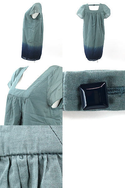 | グラデーションの配色が見た目にも涼やかな一枚です♪ 四角い首元のカッティングがお洒落な一枚。首後ろにビジューボタンがあしらわれており、後姿まで計算されたデザインが秀逸です。 ふんわりシルエットが気になる部分をカバーしてくれるのが女性にはうれしいですね。さらっと一枚で着ても様になる存在感たっぷりのワンピース。この機会に是非どうぞ♪ 使用感をあまり感じないお品なのでスタッフ一押しです。 着丈約88cm 裄丈約28cm バスト約94cm ウエスト約101cm ヒップ約115cm 【サイズ】:(-) 【素 材】:(綿100%(裏地 ポリエステル100%)) 【 色 】:(グリーン) 【程 度】:(A) 12140407-033 499 033 | ||||
