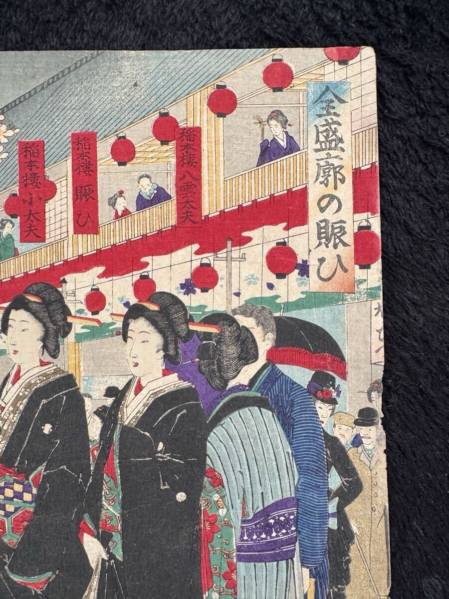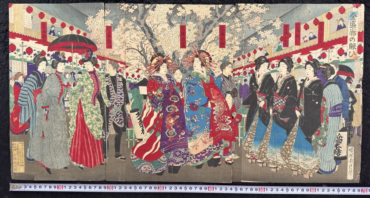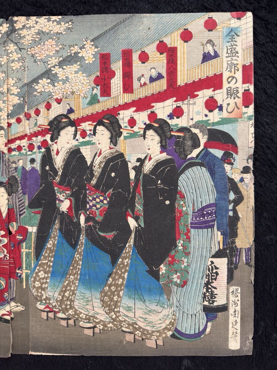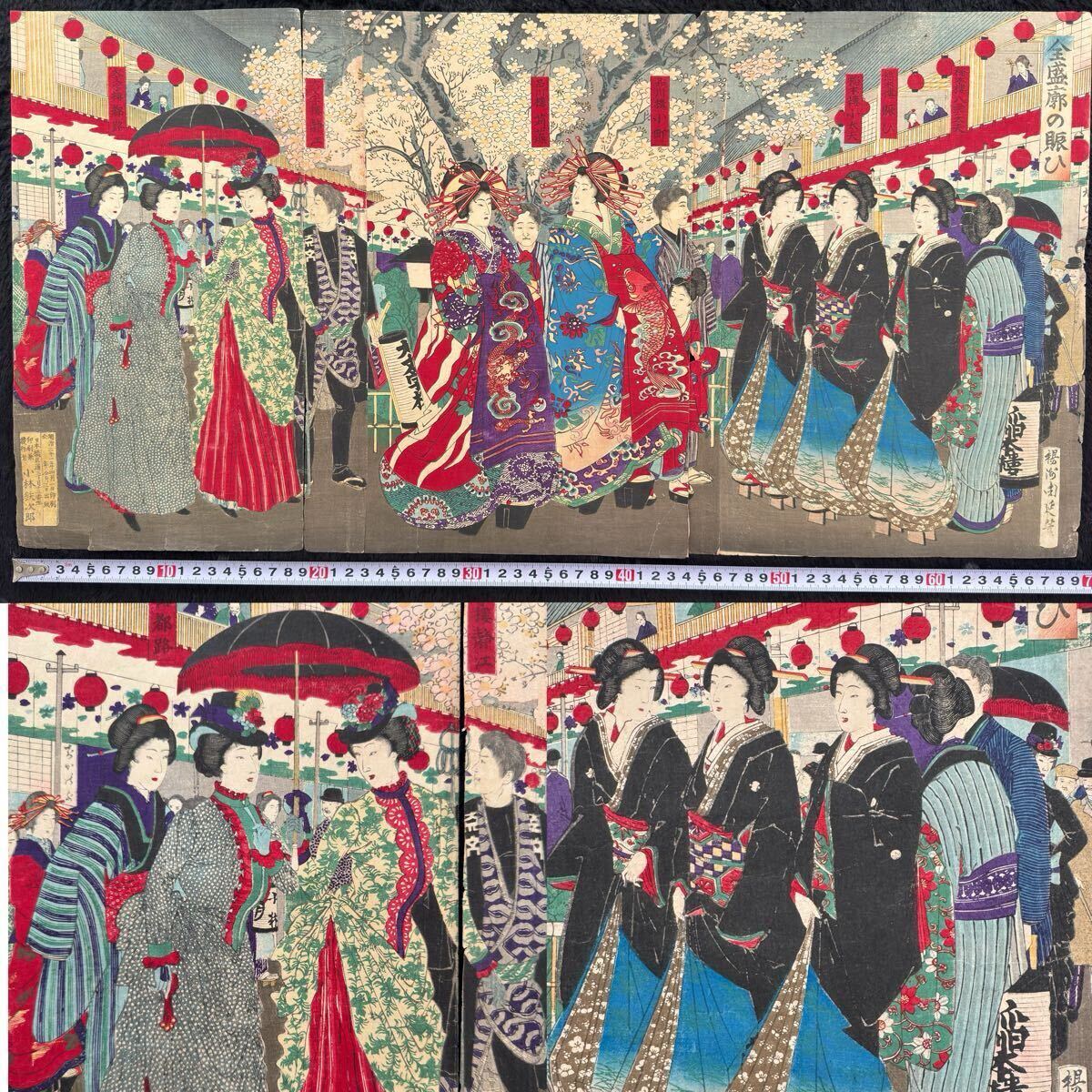 花魁!洋服!明治期/真作 楊洲周延「全盛廓の賑ひ」本物浮世絵木版画 美人画 開化絵 錦絵 大判 三枚続き 裏打ち