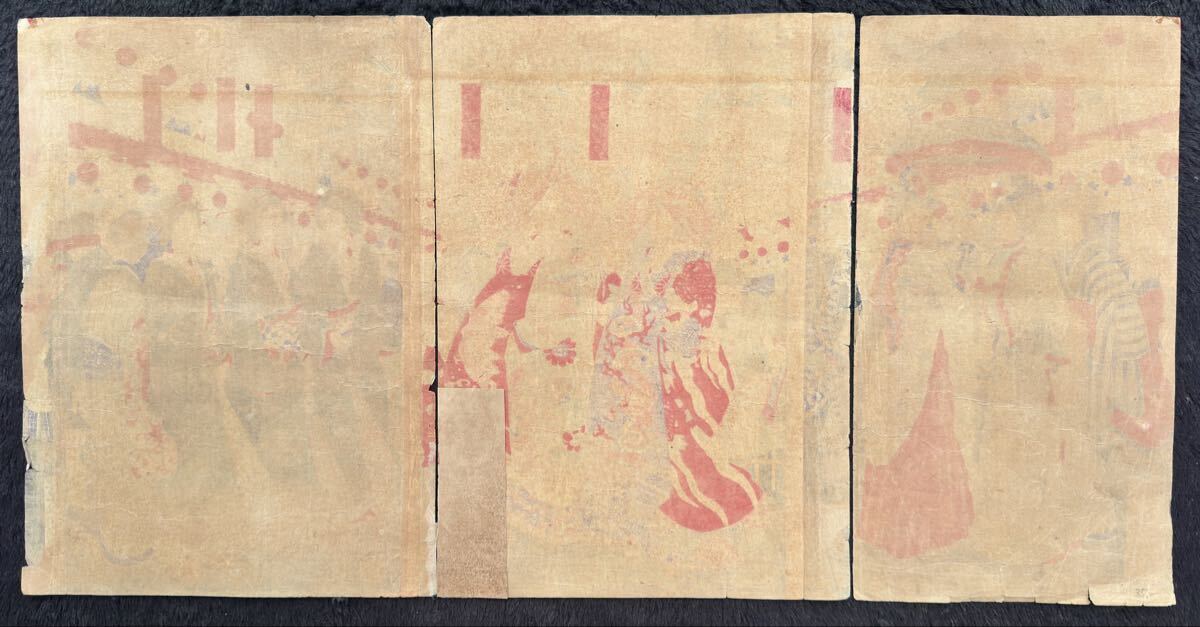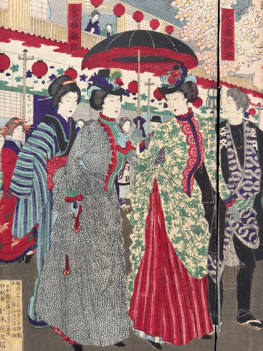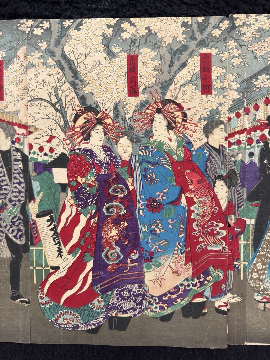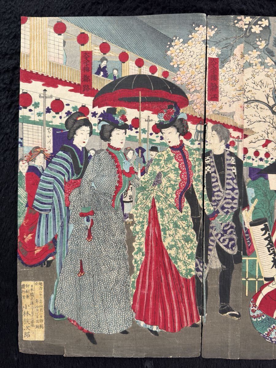 花魁!洋服!明治期/真作 楊洲周延「全盛廓の賑ひ」本物浮世絵木版画 美人画 開化絵 錦絵 大判 三枚続き 裏打ち