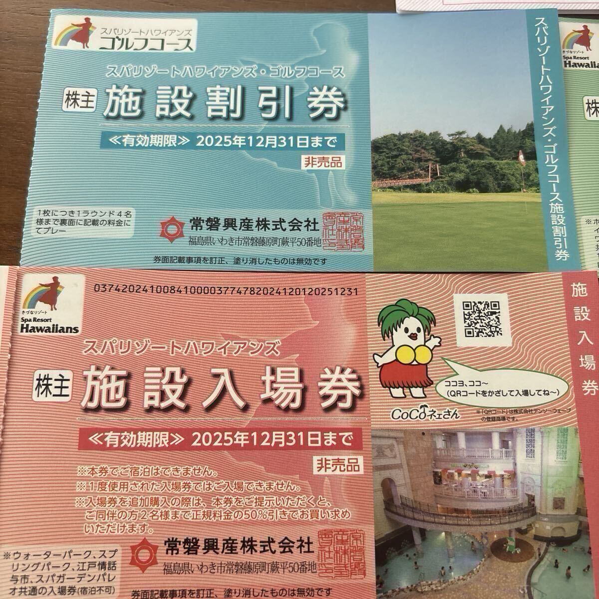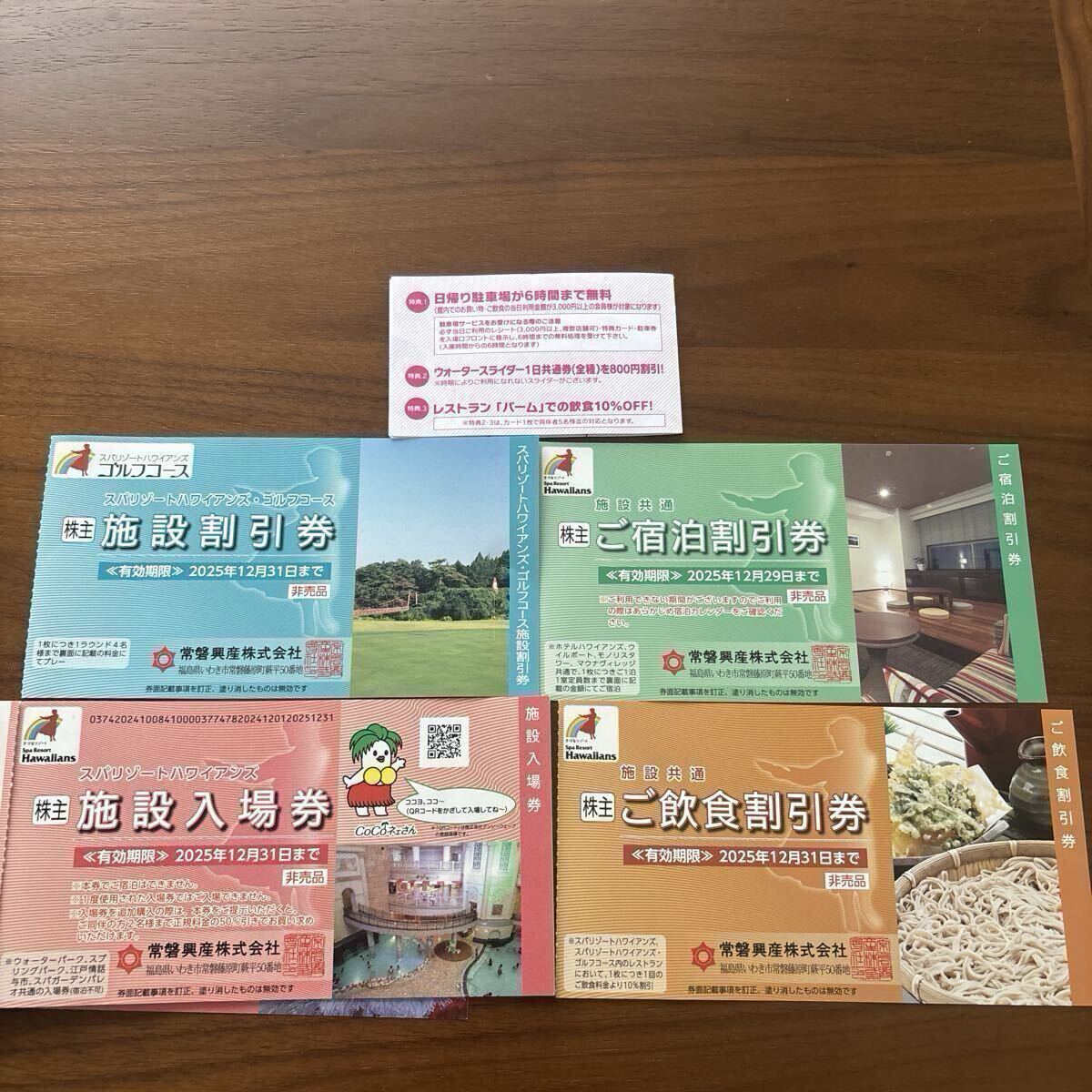 スパリゾートハワイアンズ株主優待券1枚と飲食割引券1枚、施設割引券2枚、ご宿泊割引券2枚セットです。