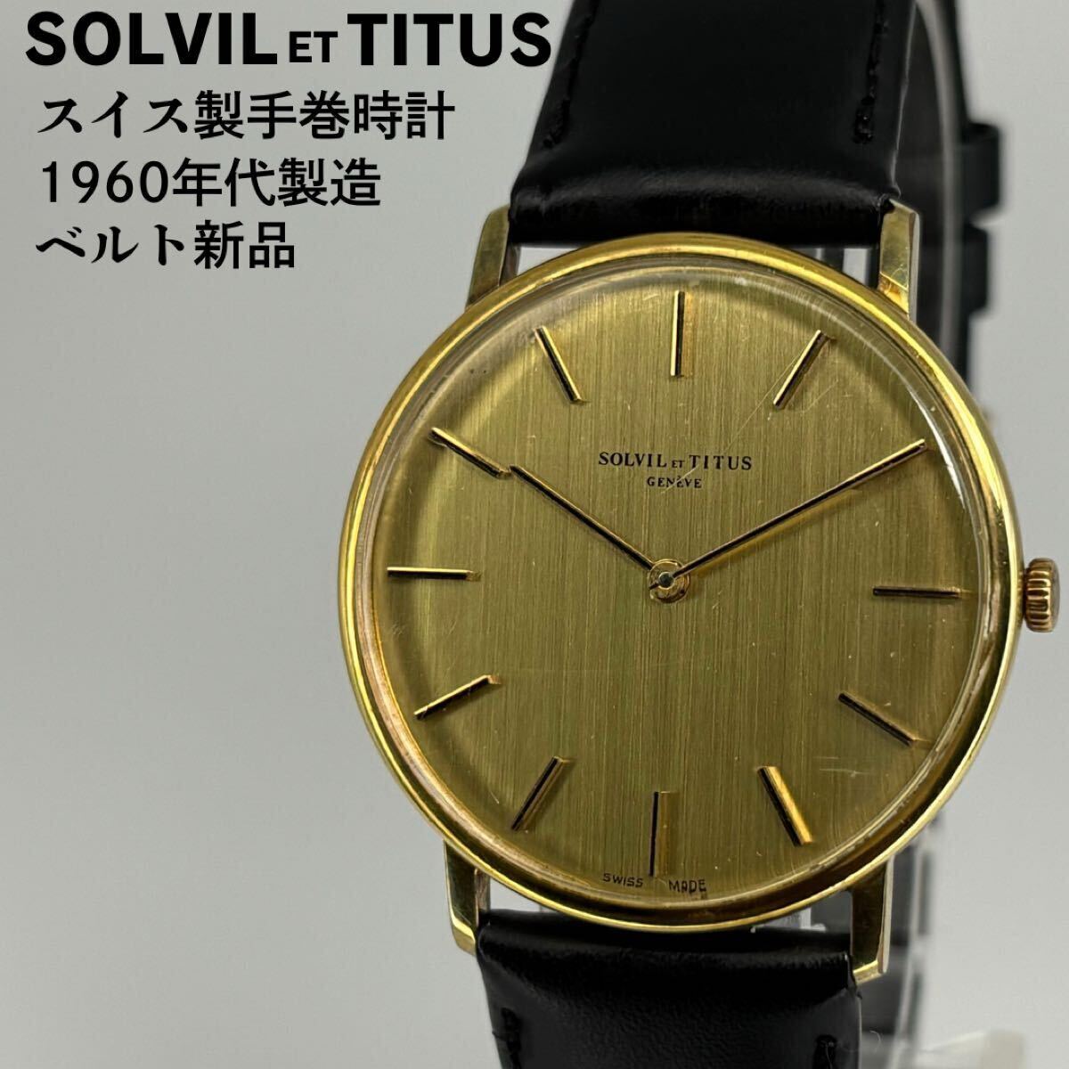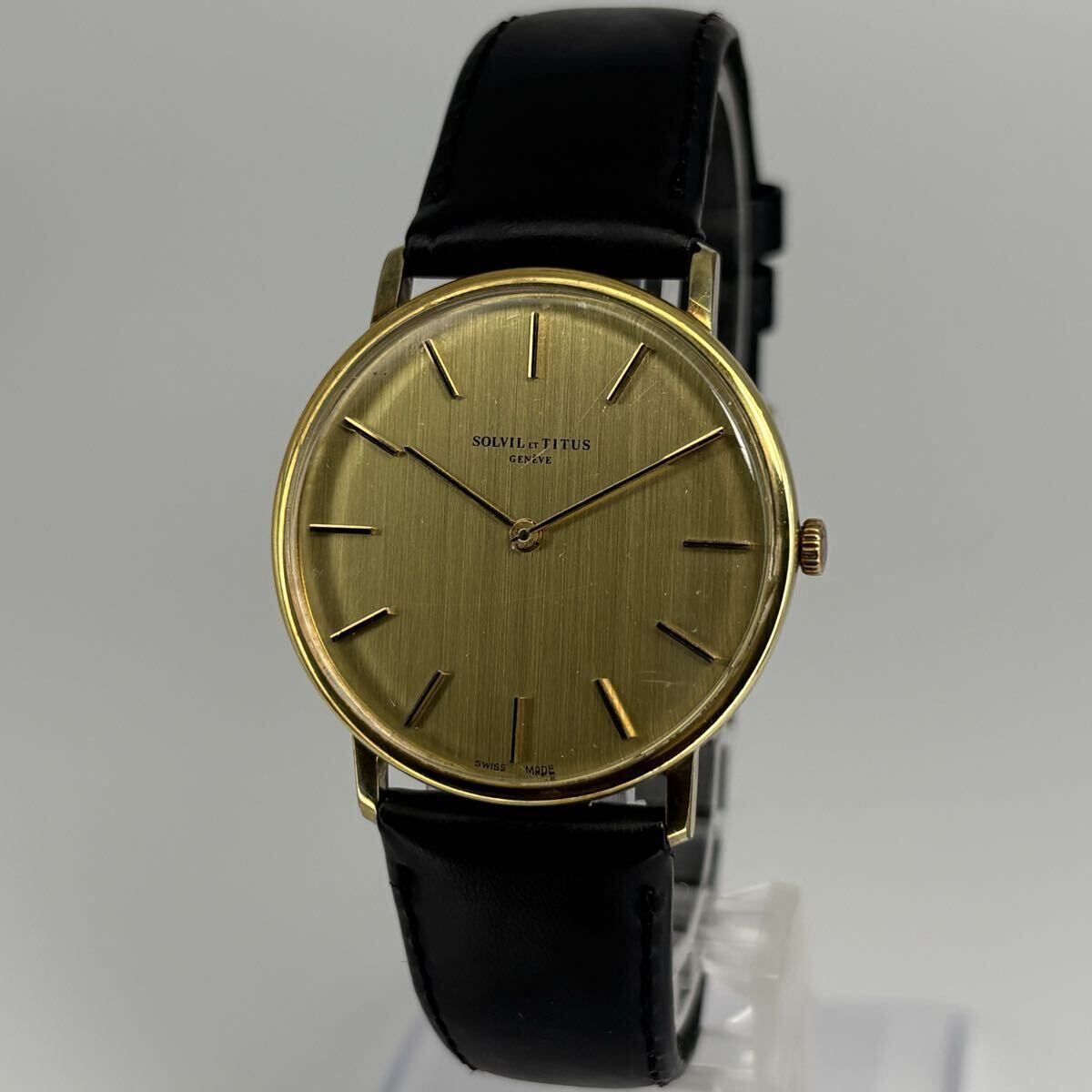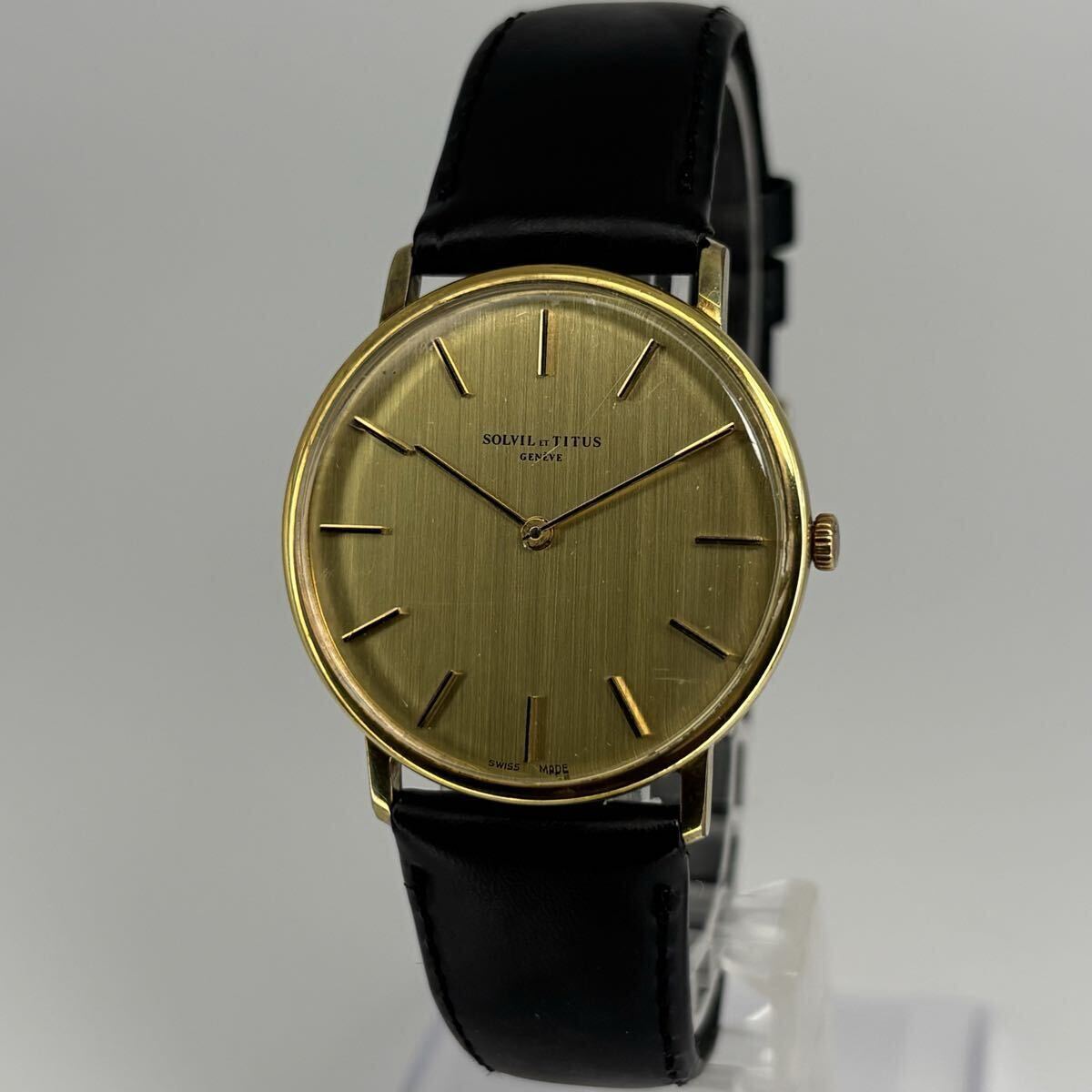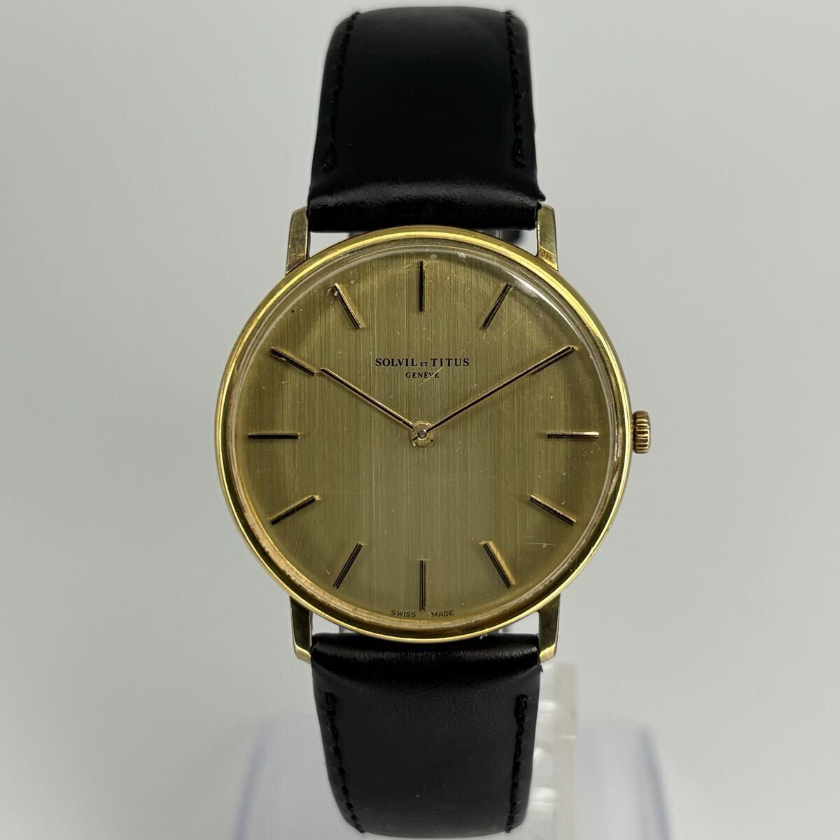 SOLVIL ET TITUS(ソルヴィル&ティトス)より、1960年代製のスイス製手巻き腕時計が入荷しました。希少なヴィンテージモデルで、ゴールド一色のシンプルかつ気品あるデザインが魅力。放射状のヘアライン仕上げ文字盤と極細バーインデックスが、60sならではの上質なミニマリズムを演出します。手巻きムーブメントはスイス製らしく精度も良好。新品交換済みのレザーベルトで快適にご使用いただけます。ヴィンテージ時計、スイス製、SOLVIL ET TITUS、手巻きをお探しの方におすすめ。ビジネスにもフォーマルにも映える、大人の魅力が詰まった一本です。この機会にぜひご検討ください。
