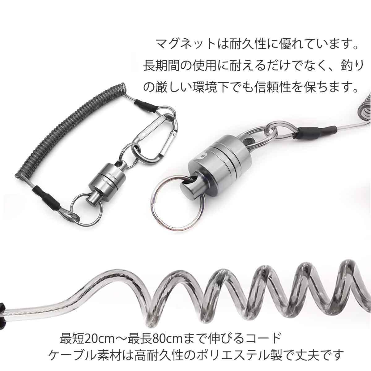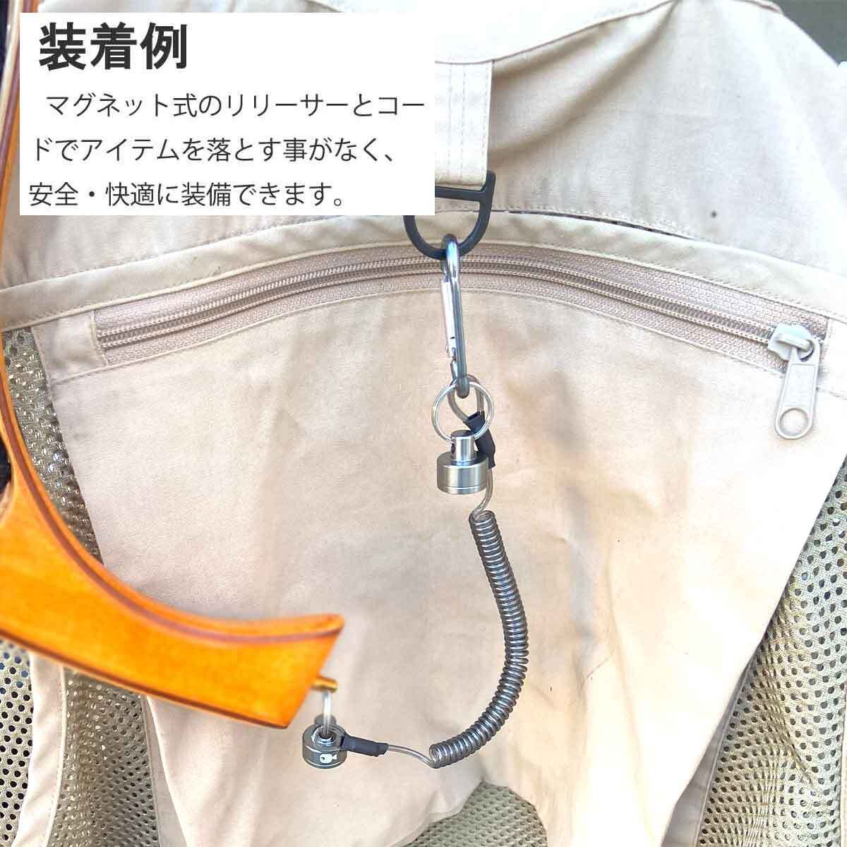 マグネットリリーサーには、カラビナが付属しているため、ベルトやバッグ、ベストなどさまざまな場所に簡単に装着することができます。さらに、ポリエステル製ケーブルは伸縮性があり、約80cmまで伸びるため、自由な動きが可能です。