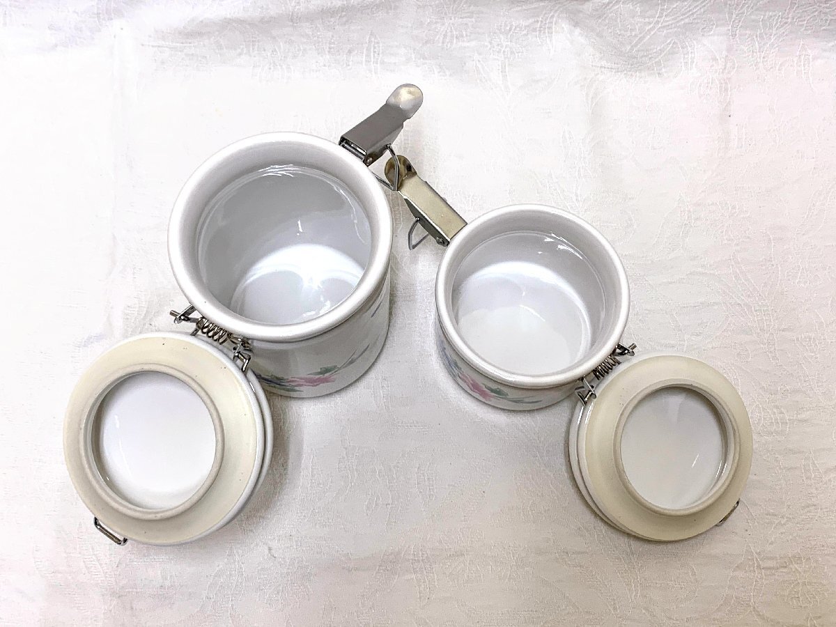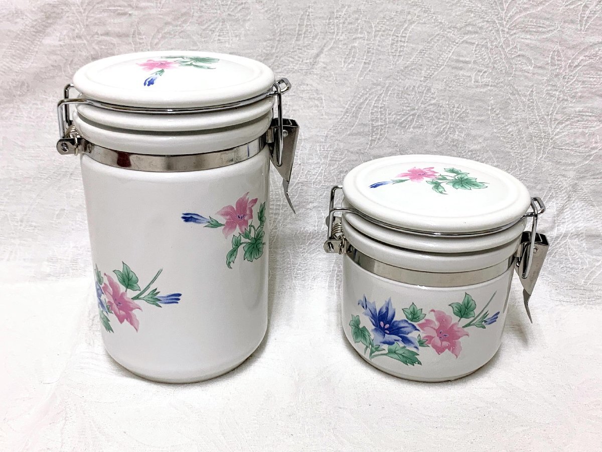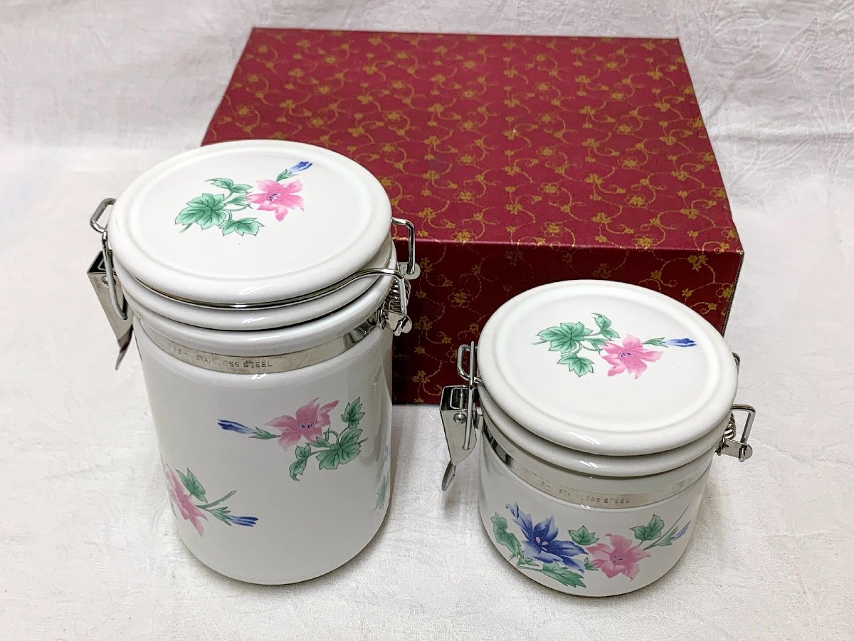 18285/レトロポップ 保存容器 密封瓶 保存瓶 大小 2個セット 未使用 紙箱 花柄 陶器 アンティーク 密封キャニスター