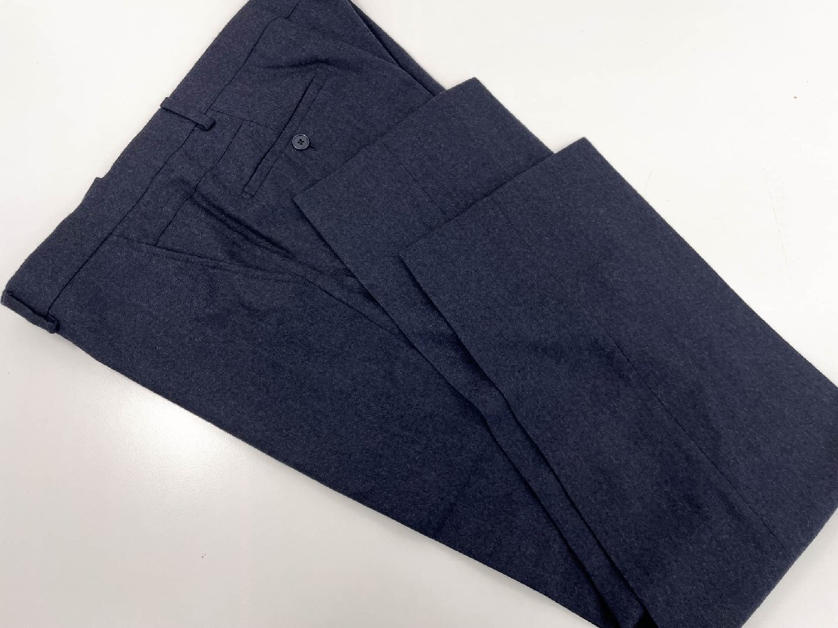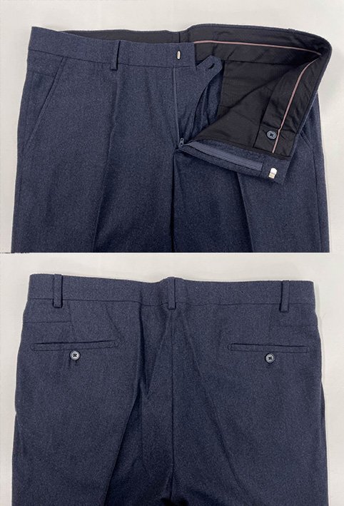 ・スラックス・・・ウエスト実寸約100センチ(0センチ出し、4センチ詰め可能です。全オーナーがウエスト出しをしております。)、股上約25~26センチ、渡り幅約33~34センチ、股下約76~77センチ、総丈約101センチ、裾幅約21.5センチ、シングル仕上げ(最大でプラス5センチ長くできます)