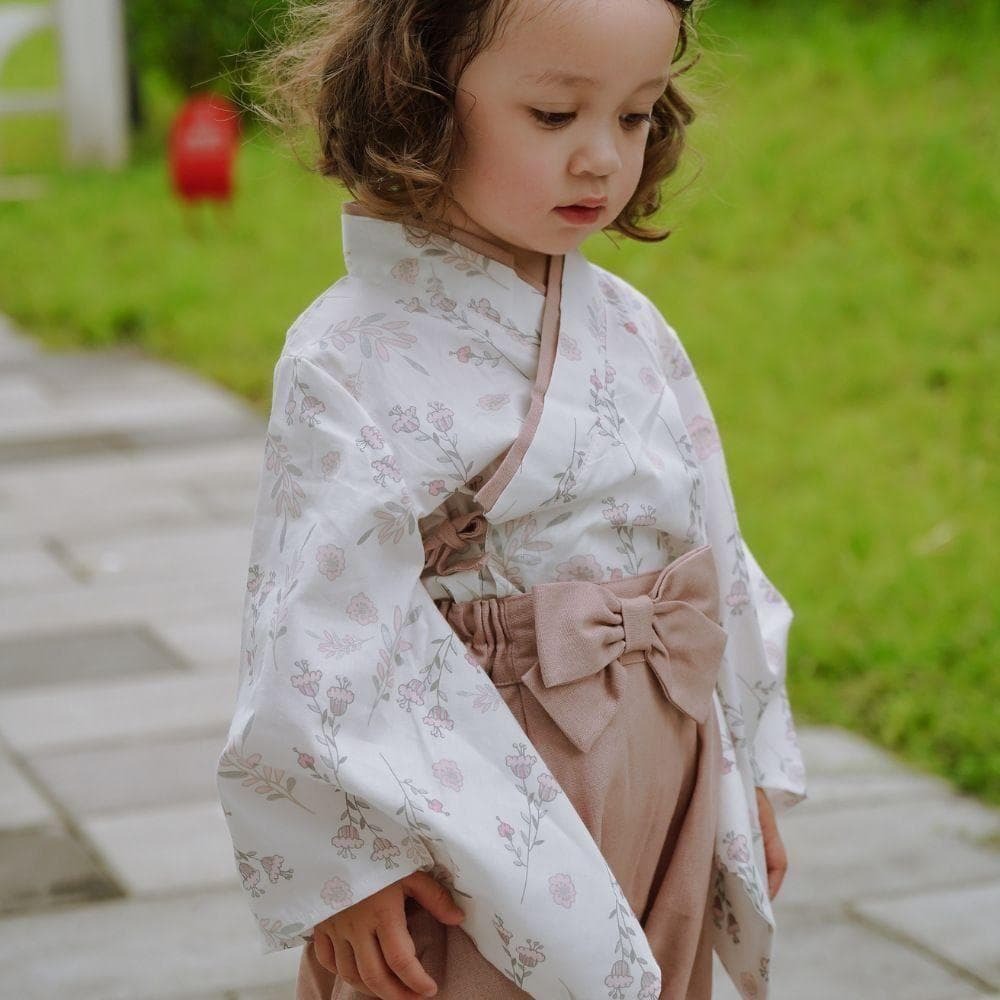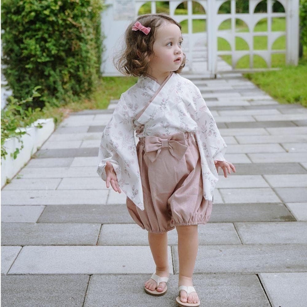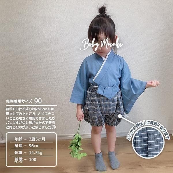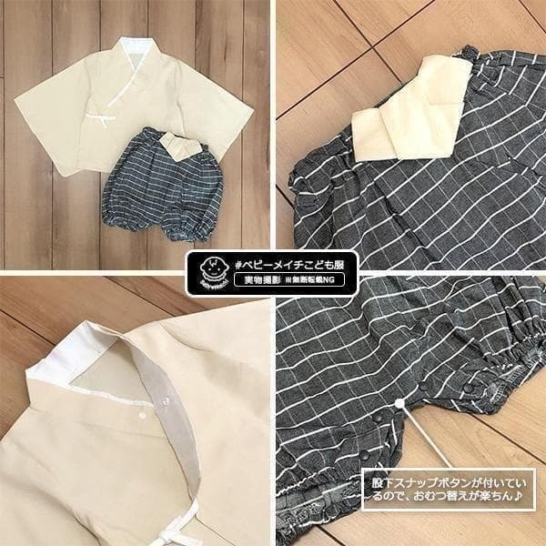 セパレートタイプのベビーキッズ袴、上下2点セットです!上は短肌着や甚平のように紐とスナップボタンで脱ぎ着ができ、かぼちゃパンツは股スナップボタンで全開にできるのでおむつ替えも楽ちん♪お宮参りやお食い初め、初節句のお祝い、お正月、七夕、お祭りなど幅広いシーンで活躍します!
