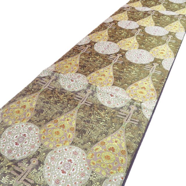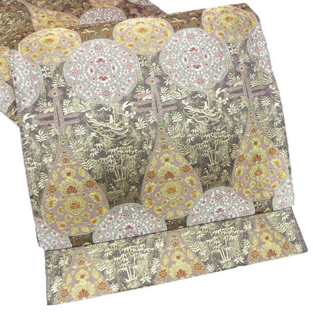 | サイズ 441.5cm x 30.5cm 素材 正絹 商品ランク A ●お色 涅色 多色 金 金銀箔糸をふんだんに織り込んだ豪華な袋帯。 古代の宝物に見られる文様を図案化した正倉院文様を、立体的に表現しています。 光の角度できらめきが変化し、奥行きのある華やかさが魅力です。 未使用の美しいお品物です。 一部商品は実店舗・他サイトでも並行して販売しておりますので売り切れの際はご了承ください。 その他多数出品中 gu- | ||||||