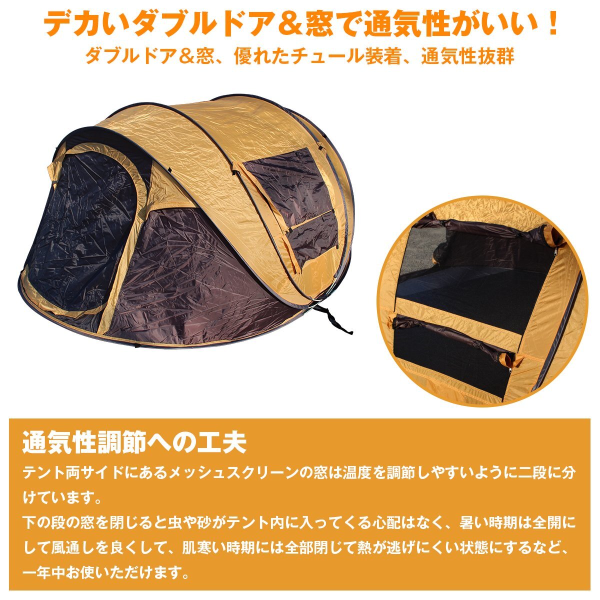 3人から4人用! 簡単組み立て! ワンタッチ式 ドーム型 テント キャンプ アウトドア ワンタッチテント ドームテント ベージュ 簡易テント