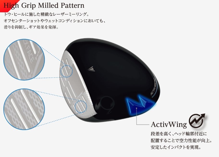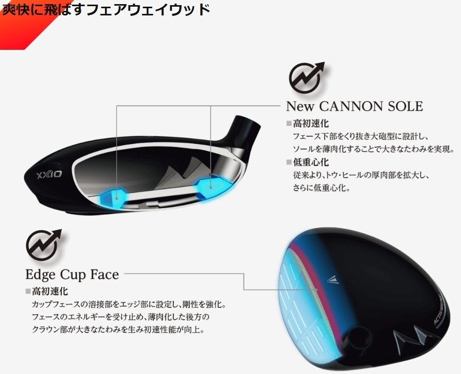 | さらに高く、さらに遠くへ 爽快に飛ばすフェアウェイウッド ●NEW CANNON SOLE:■高初速化 フェース下部をくり抜き大砲型に設計し、ソールを薄肉化することで大きなたわみを実現。■低重心化 従来より、トウ・ヒールの厚肉部を拡大し、さらに低重心化。 ●Edge Cup Face:カップフェースの溶接部をエッジ部に設定し、剛性を強化。フェースのエネルギーを受け止め、薄肉化した後方のクラウン部が大きなたわみを生み初速性能が向上。 ●さらに磨かれた安定性:High Grip Milled Pattern トウ・ヒールに施した精緻なレーザーミーリング。オフセンターショットやウェットコンデイションにおいても、最適なギア効果を発揮。 専用ヘッドカバー・保証書付き。日本正規品。 | |||