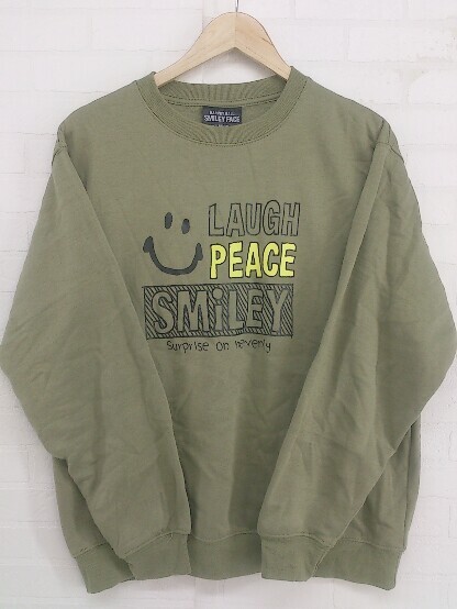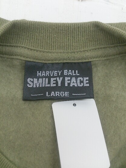 ◇ HARVEY BALL SMILY FACE フロントプリント 裏起毛 長袖 トレーナー カットソー サイズL カーキ マルチ レディース