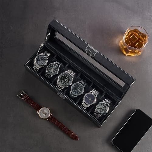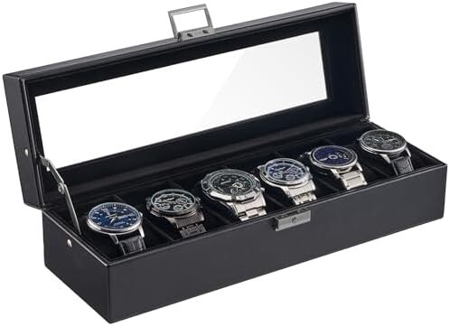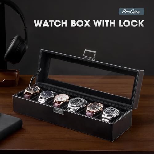 ProCase ウォッチボックス 6スロット メンズ PUレザー ジュエリーオーガナイザー ディスプレイ収納ケース ガラス蓋付き (オールブラック)